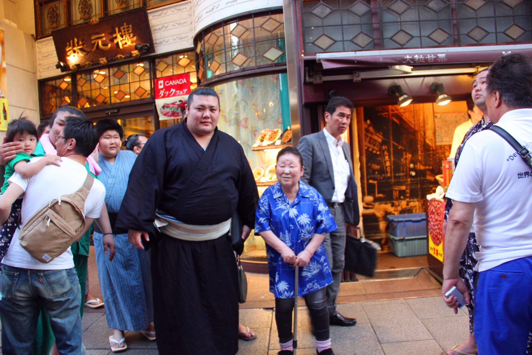偶遇相扑手,还挺配合的看了镜头。觉得相扑手挺辛苦的,要拼命的吃吃吃,胖了还会各种病。佩服!