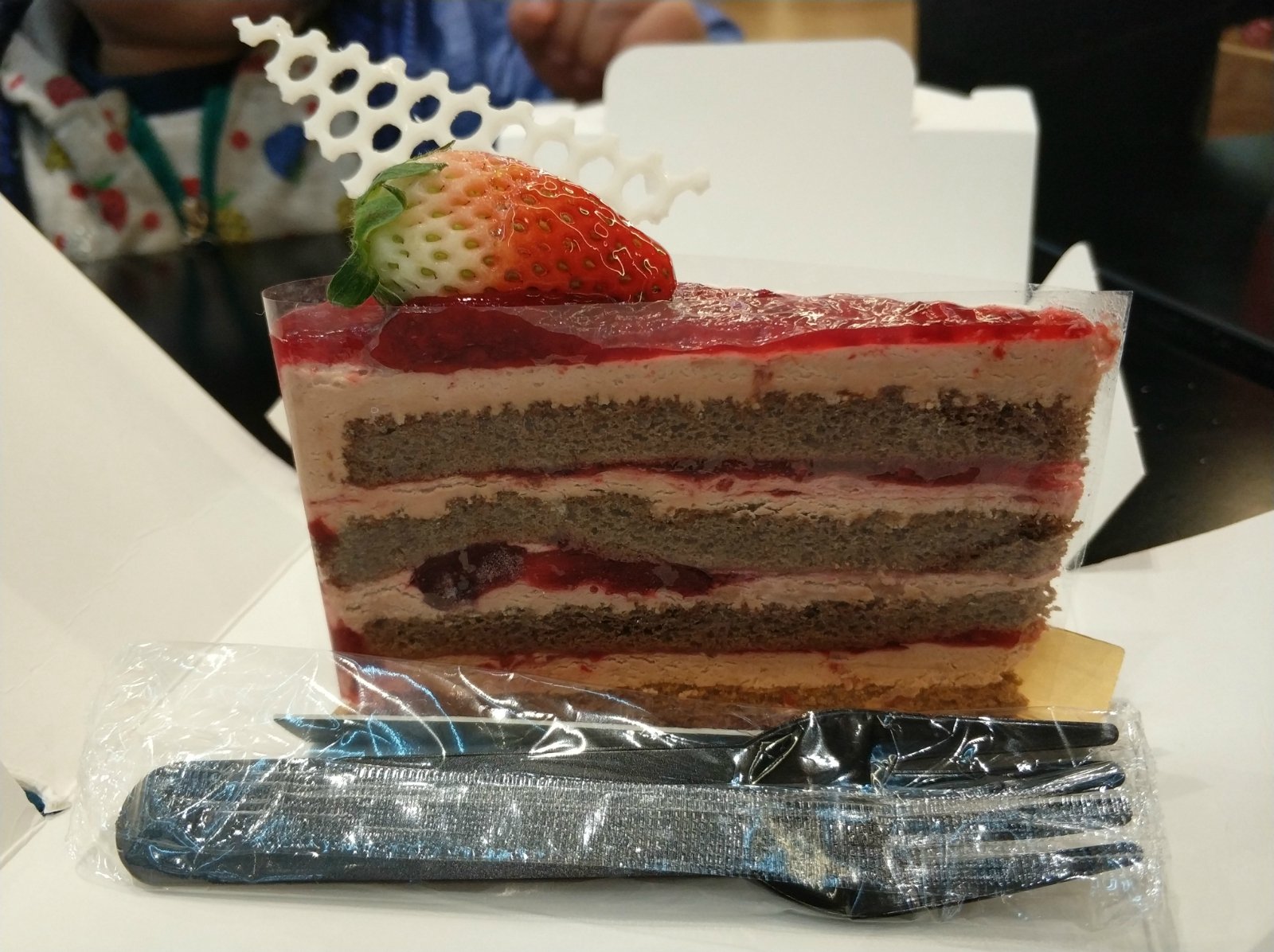我们点了迷情style的草莓蛋糕切块,上面涂抹着满满的草莓酱,略有些偏酸。由于是慕斯蛋糕,有些偏凉,细心地工作人员给小朋友倒了热水,让配合着吃,服务很不错。