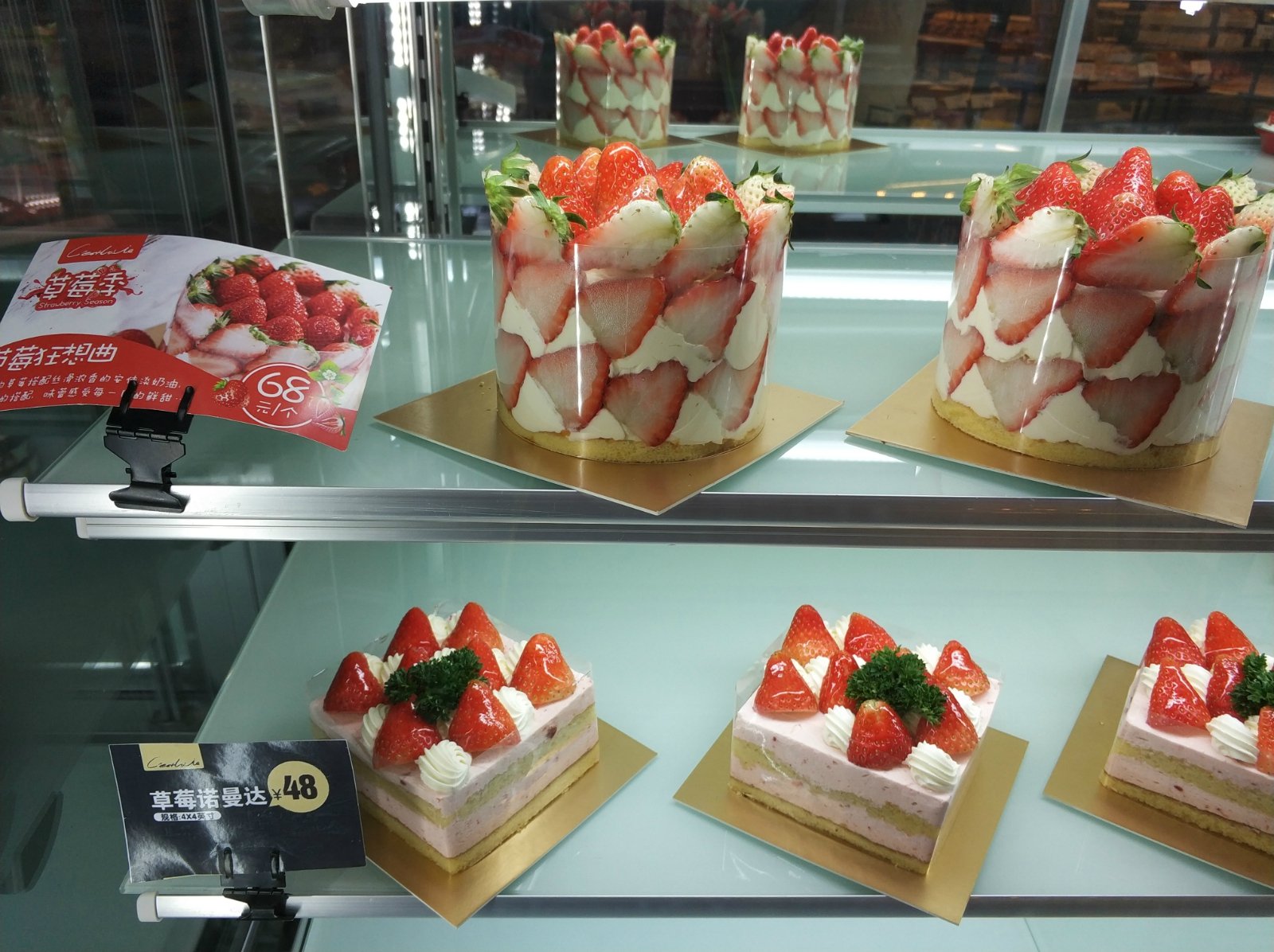 店内主营烘焙面包、各类慕斯蛋糕、暖手茶和一些进口零食。由于最近是草莓季,很多产品便都以草莓作为主题进行制作,从售价8元的草莓魔方,到68元的草莓慕斯蛋糕,均有提供,不同价位覆盖还是比较全面的。