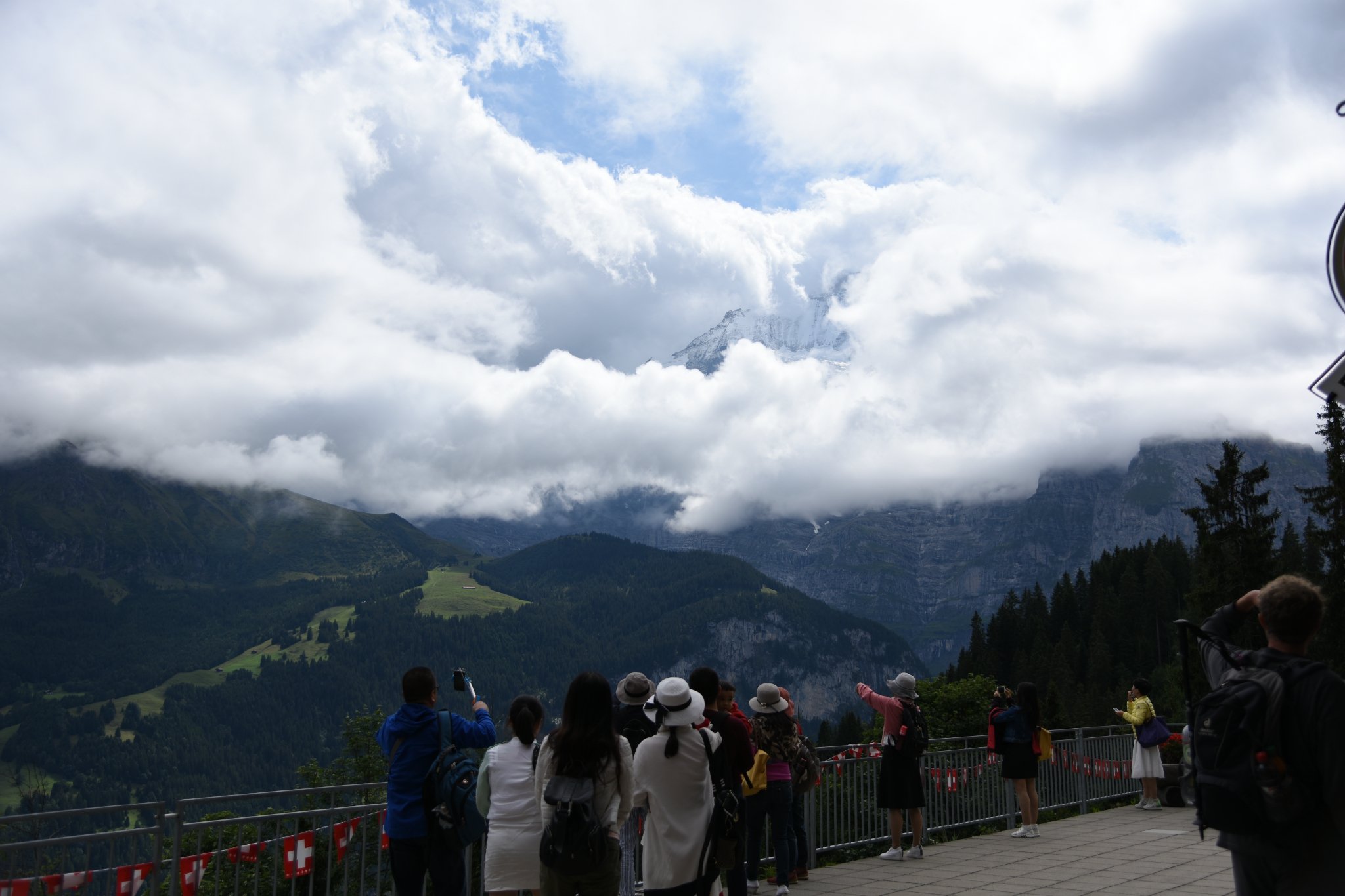 刚好拨云见日,乘着下缆车换火车的间隙,艾格峰挣脱了云雾的包裹,人们都在竞相一睹艾格峰的雄伟英姿。转眼,它又被云层包裹住了,好像起来撑了个懒腰,接着再睡