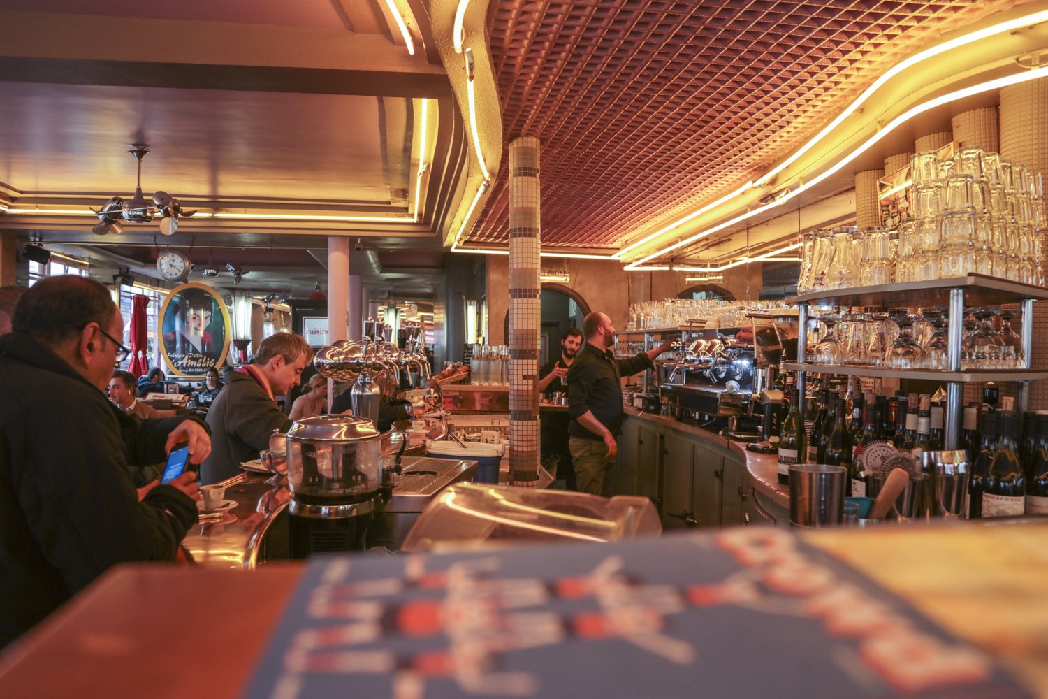 这里就是电影《天使爱美丽》里,艾米丽工作的那家餐厅啦。从推开门的那一瞬就仿佛穿越到电影的场景里。我们坐在了占有欲强烈的约瑟夫的位置,角落卖香烟的柜台已经撤掉了,吧台边依旧人来人往,只是服务生和老板娘都变成了法国壮汉。墙上挂有一些电影的剧照。