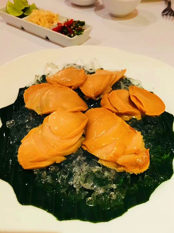 海鲜可以点上一份新鲜的鲍鱼,全部是新鲜的上好品质, 尤其上面还有冰块,口感也超级棒,吃一片,蘸点芥末,超级美味。