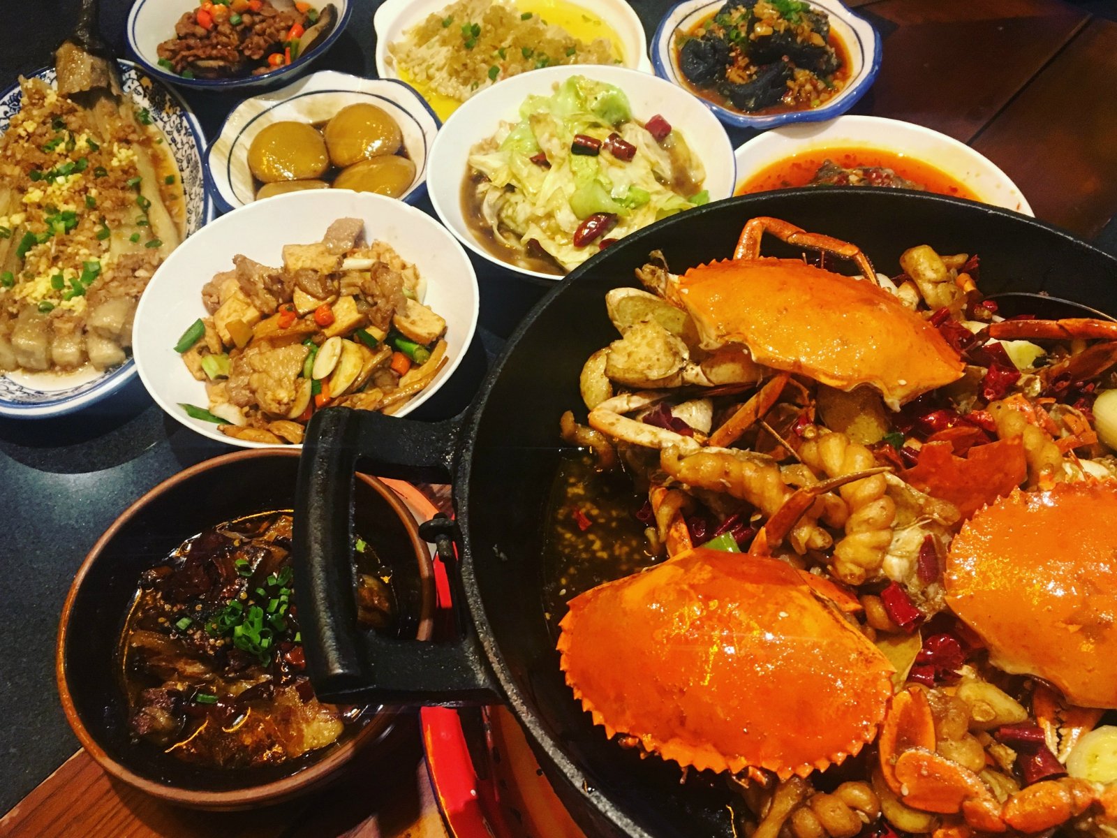 菜品则以湖南菜为主,微辣咸香。主打菜是香辣蟹,这里的螃蟹都比较大,一般两个人吃2-3只。螃蟹都是新鲜活的,所以肉质Q弹,配上湖南特色的辣椒、花椒,回味无穷。最特别的是里面用麻花作为配菜,麻花的脆配上蟹肉的软,很奇妙的口感。秋季的螃蟹更加膏满黄肥。