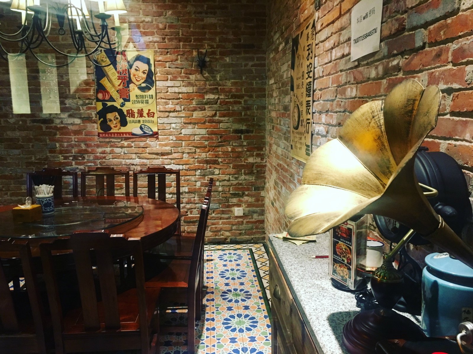 一到餐厅就是一股浓浓的怀旧风情,复古的地砖,墙上贴着三四十年代的海报,旁边还放有留声机,风格独特。餐桌上喝水用的是搪瓷杯,一上桌服务员就会先上一碟瓜子。