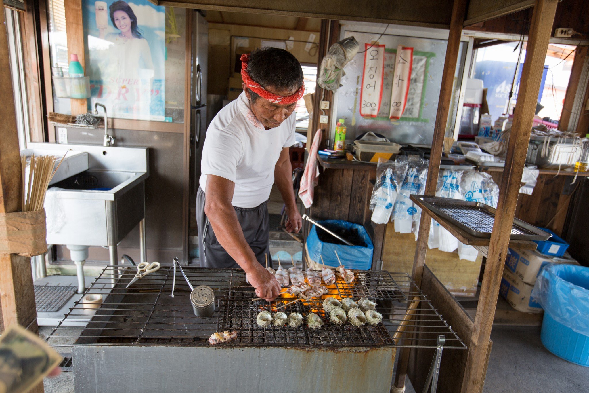 走回停车场,旁边就是一家小餐厅,店主在烧着刚上水的角螺和鱿鱼。很简单的设施,就是原始的炭火加铁丝网,鱿鱼在火上烧得吱吱作响,香味扑面而来,我们又饿了