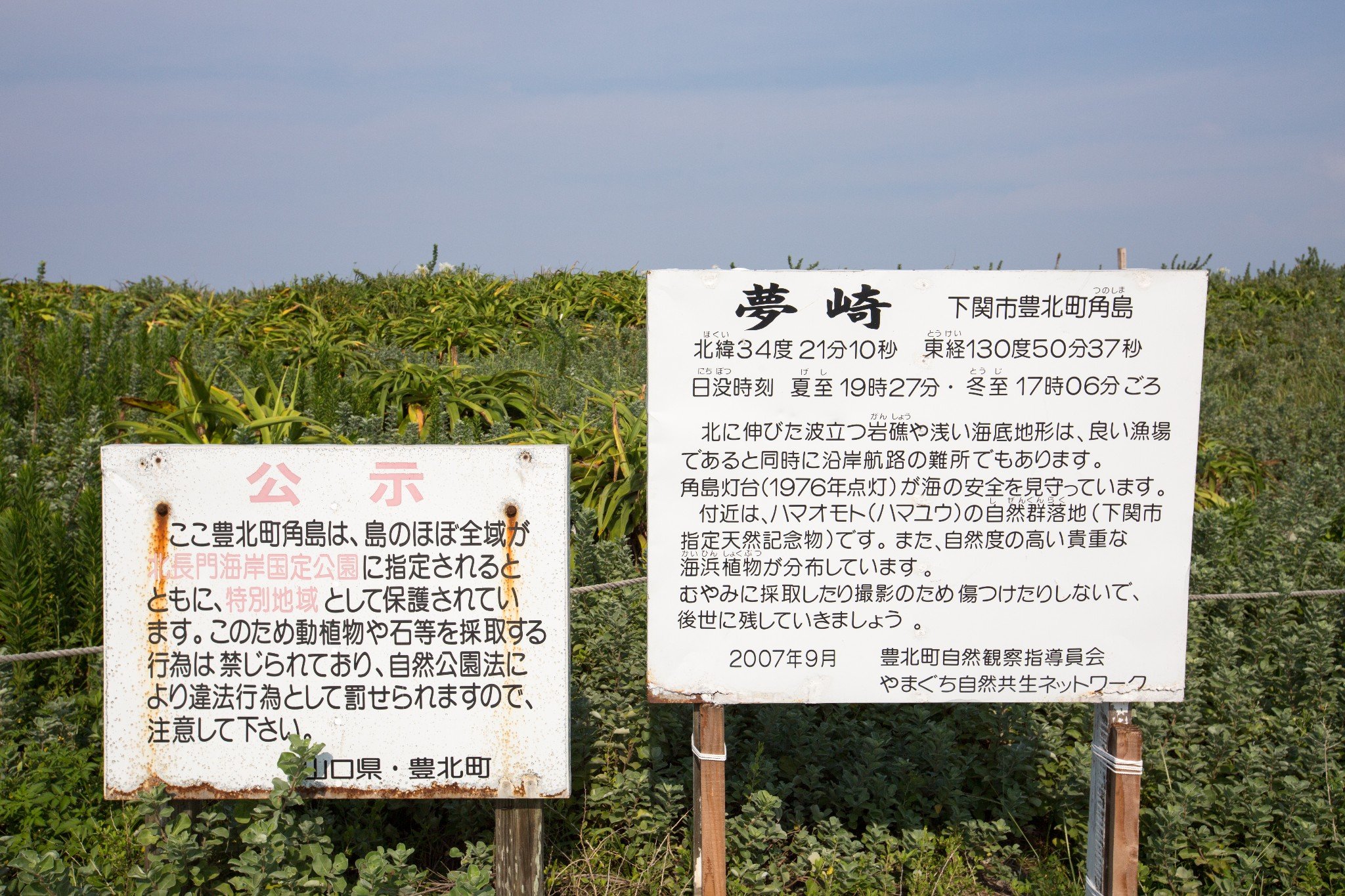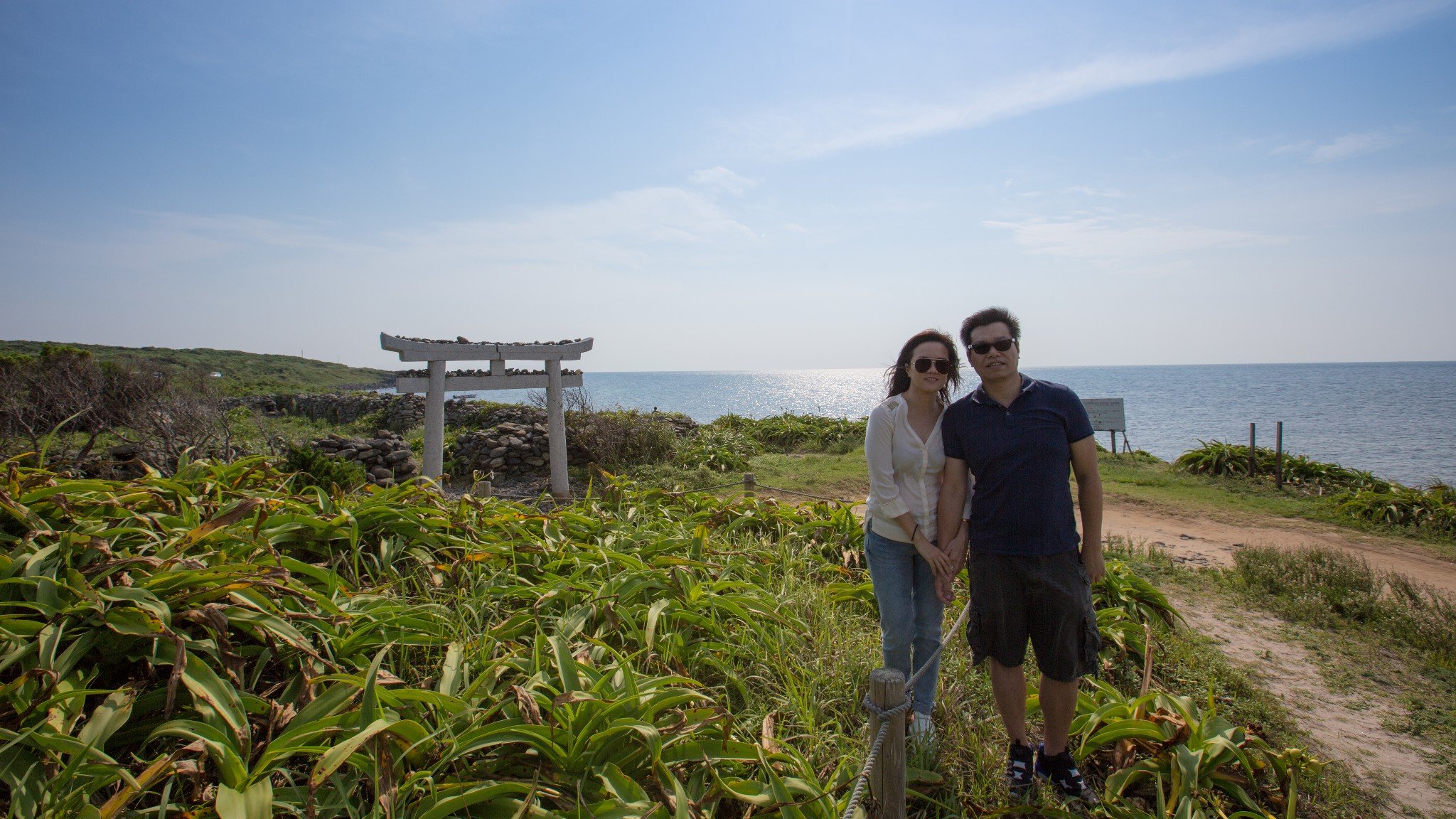 角岛其实很小,就一条公路,沿着大桥一直开到底,有一个灯塔公园。停车后,一直往里面走,就是一个叫梦崎的地方,有着最奇特的海边鸟居。崎是日文,意思是很小的半岛。风景确实是很梦幻的,好像到了日本动画片中,刺眼的阳光打在海上反射出阵阵磷光。岸边还就我们两个人,为所欲为地照相。