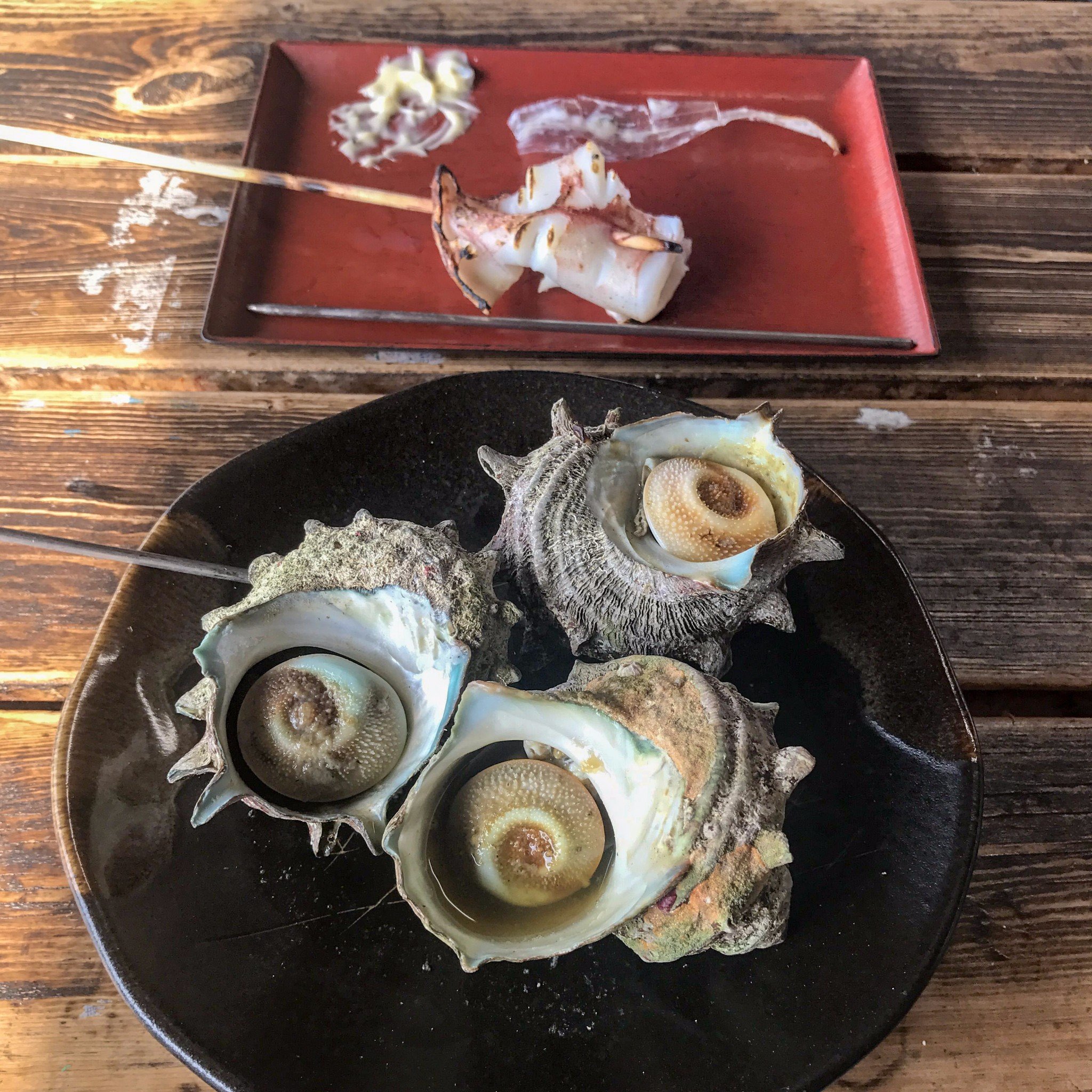 这里角螺可是最新鲜的,三颗才500日元。烧好后,螺上面还有汁,喝了一口汁,好鲜甜啊,新鲜的大海味道!比“寿司大”好吃一百倍,还不用等,还很便宜。这才是旅行的精髓吧,找到可遇不可求的美味。