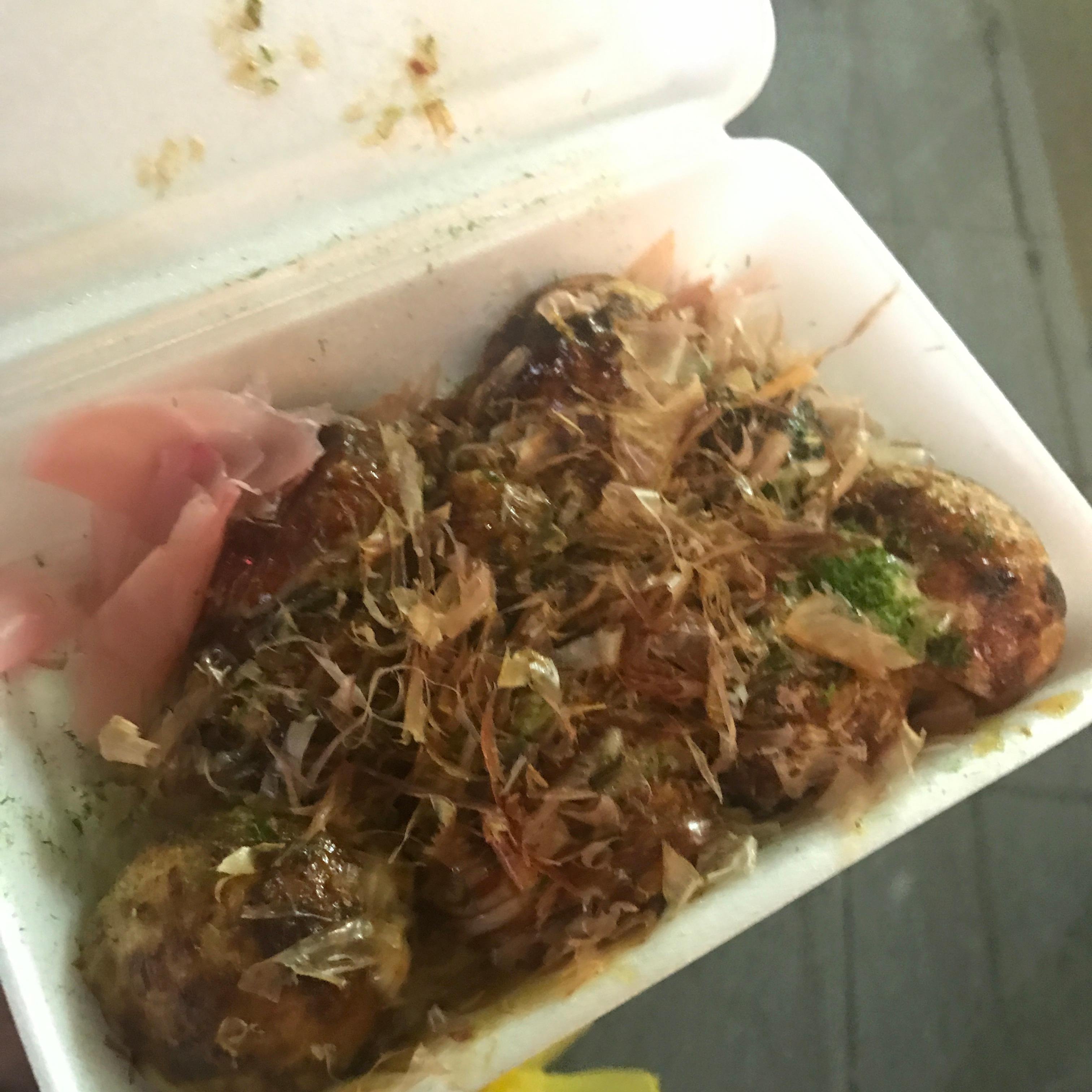 美食街第1趴:章鱼小丸子,排队最多的那里就是了,里面真的有章鱼,但感觉京都吃的抹茶章鱼小丸子更好吃,烫烫烫烫烫烫!重要的事情说六遍!【500日元】