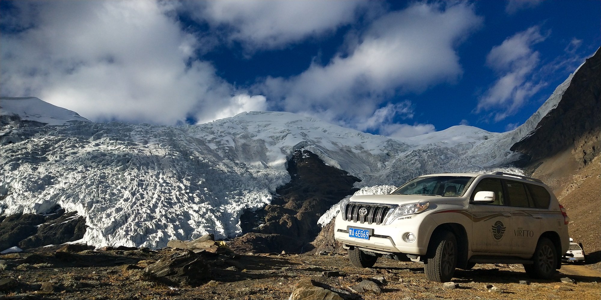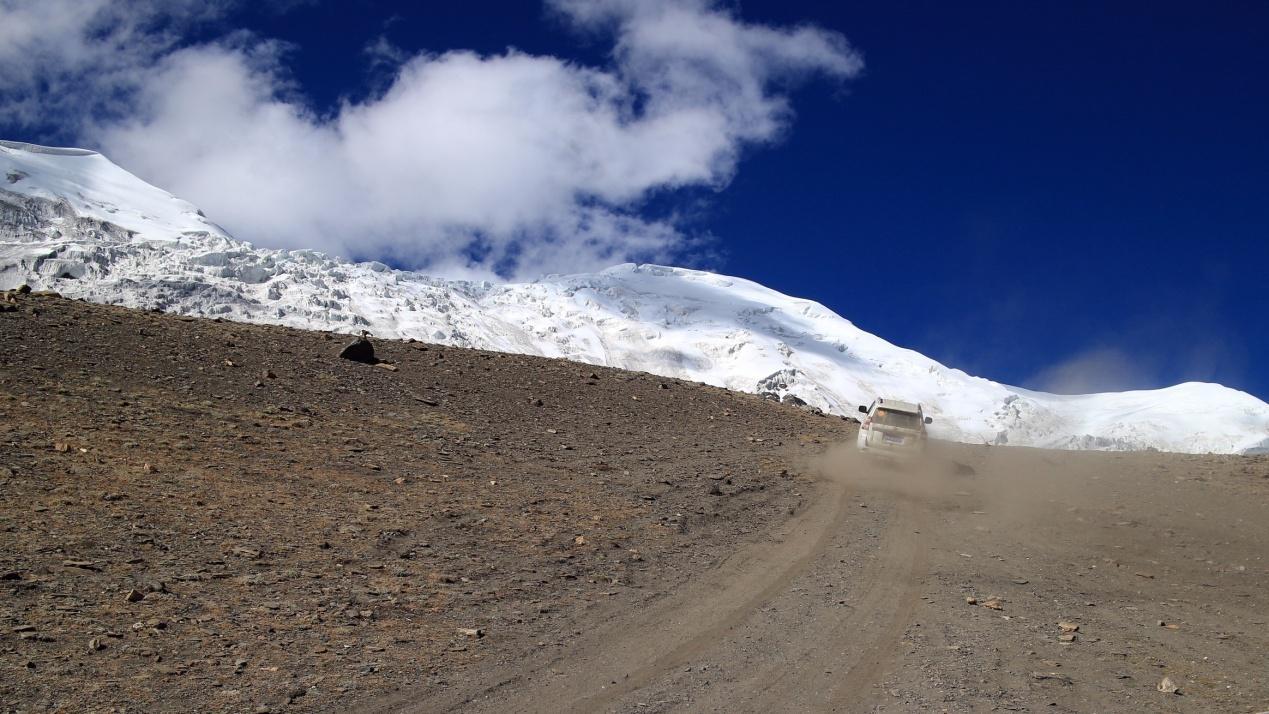 过浪卡子不久,就到了卡惹拉冰川所在地。当汽车爬上一个很、陡很高很长的坡后,一条巨大的冰川从雪峰倾泻下来,扑面而来,从远古走来。不知什么年月,不知什么时刻,停止了流动,停止了融化,被凝固下来,成了现在的模样。