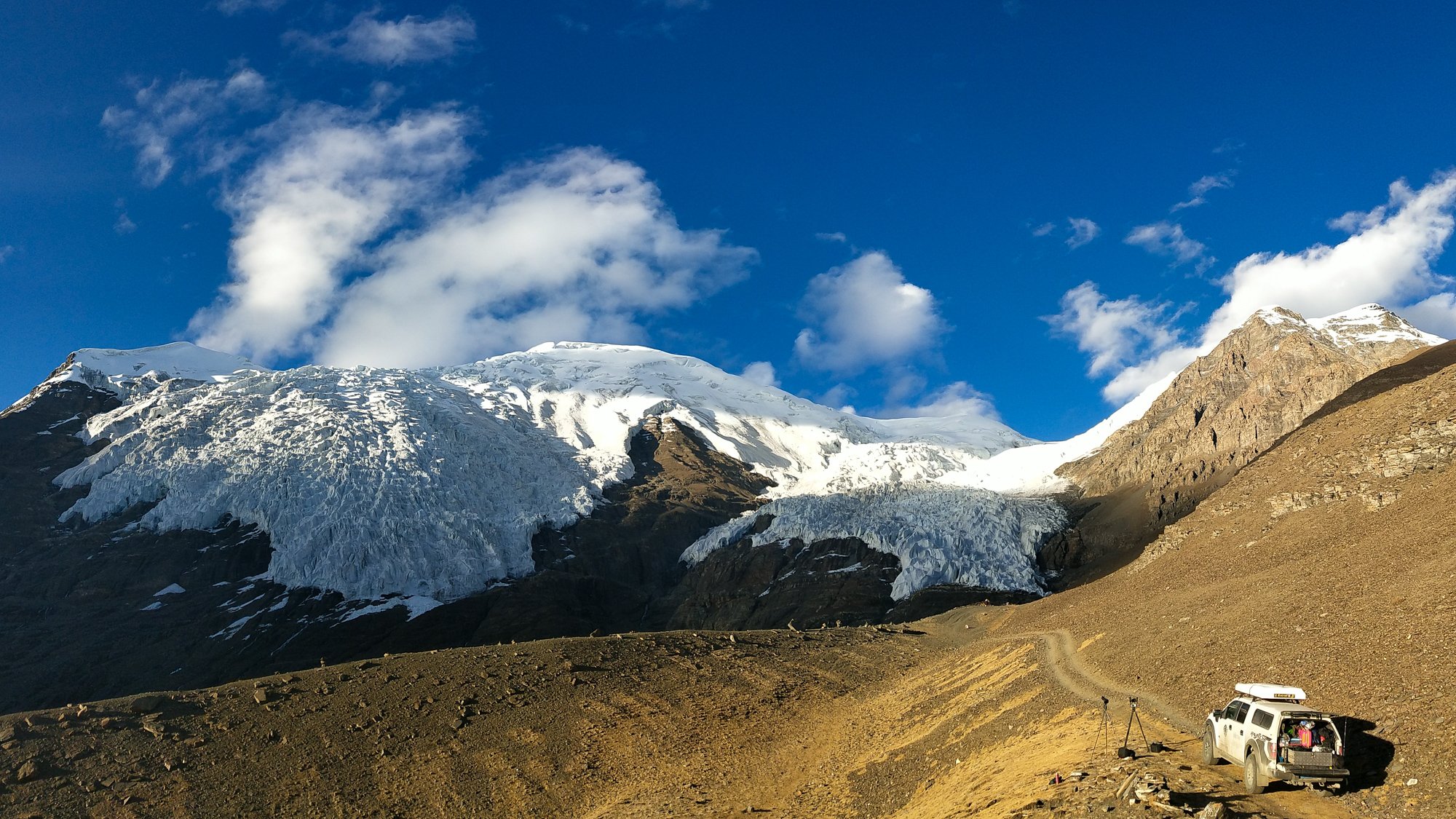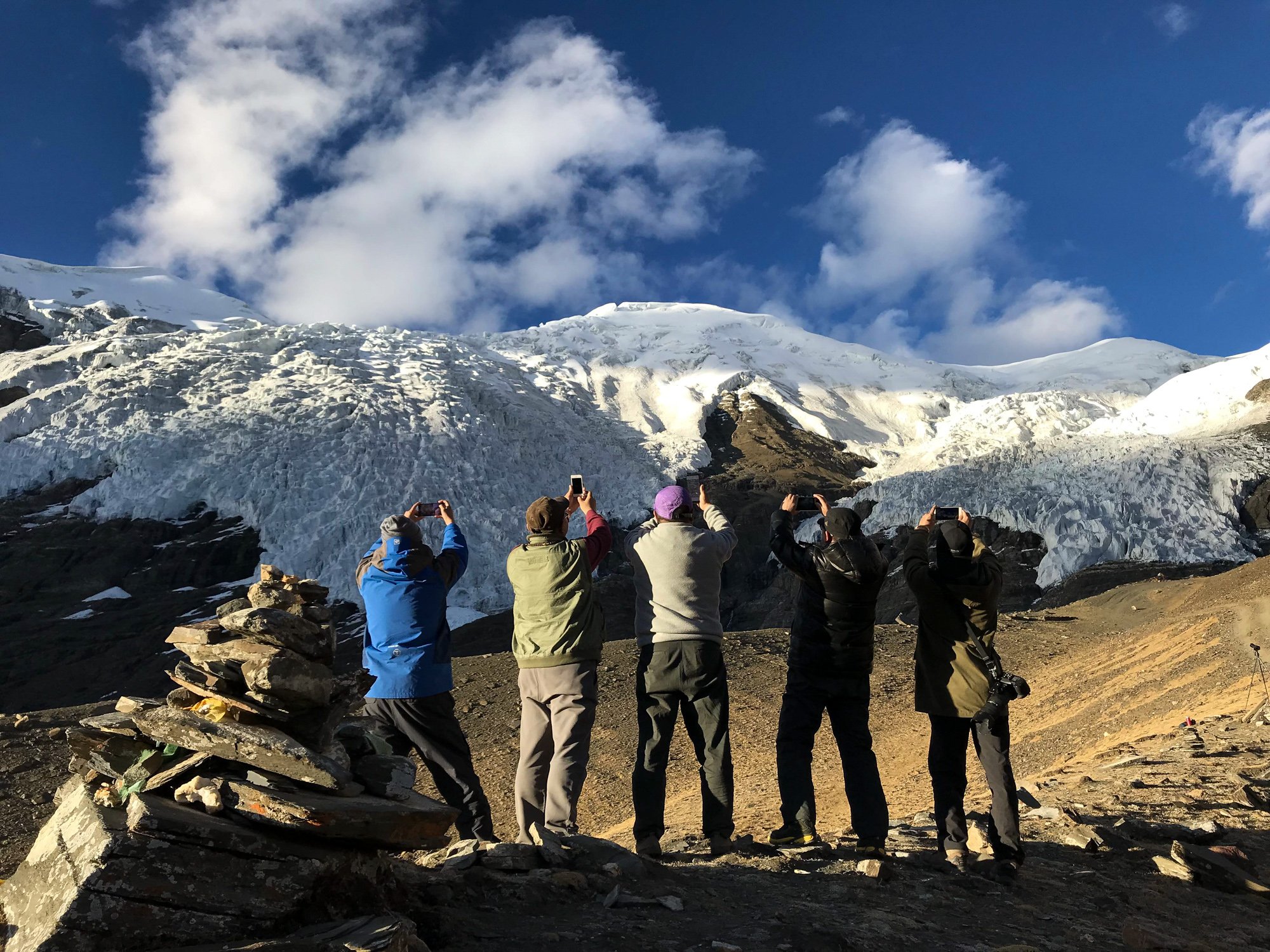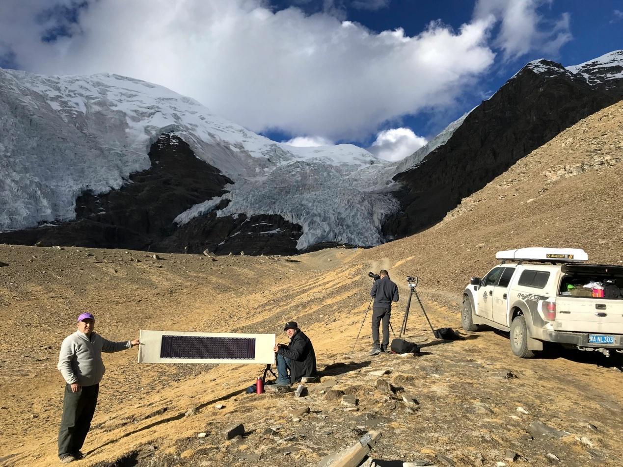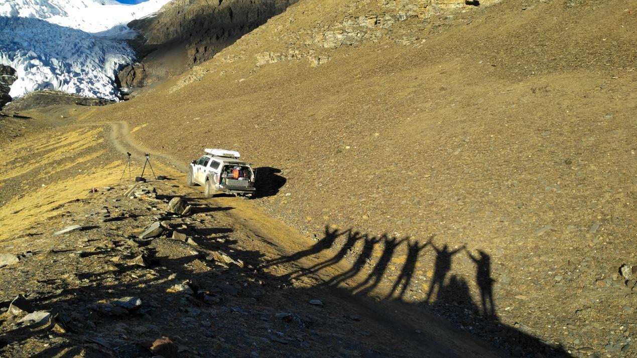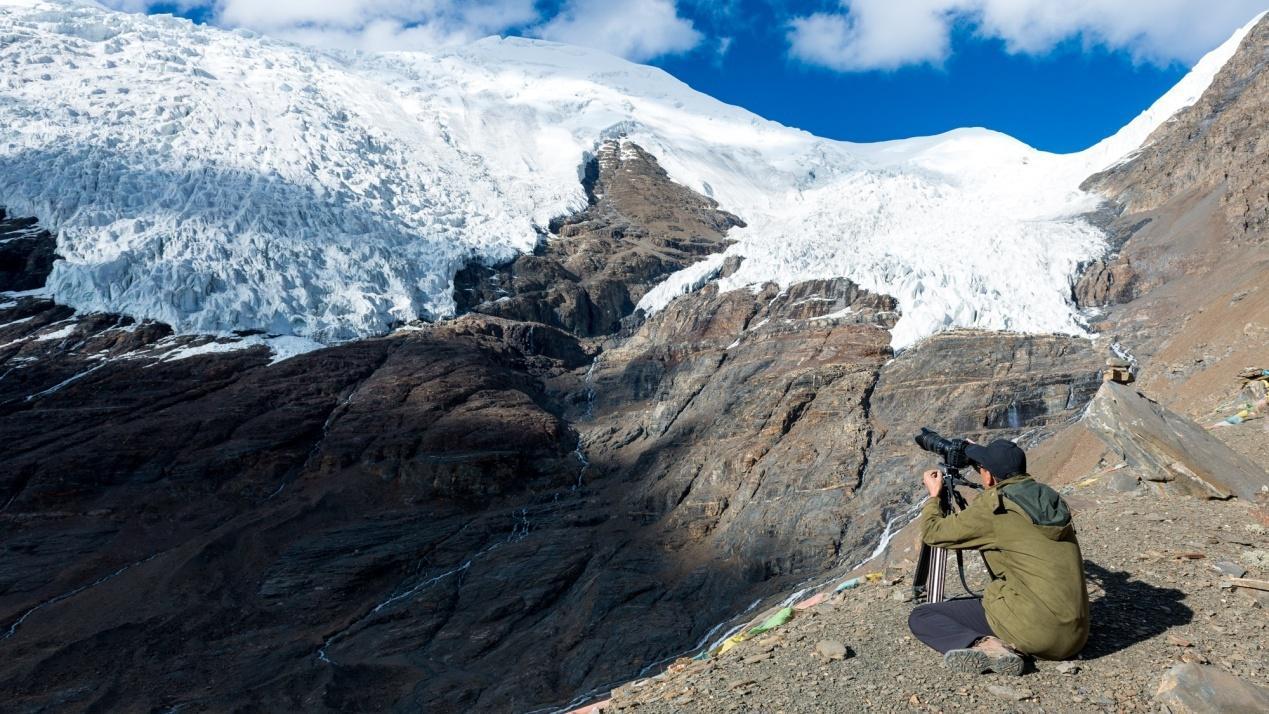 老林率大家架设各种摄像器材,拍摄这个巨大的著名的古冰川。冰川上有个三角形缺口,据说是拍电影《红河谷》时,为营造雪崩的真实感爆破造成。这个缺口也许永远都无法弥补了。