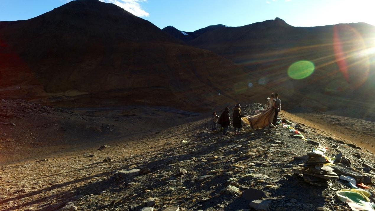 到处是石头的山坡上,映着老林团队手拉手长长的身影,不远处一对新人不顾寒冷高反拍摄婚纱照,一切都显得那么美好……