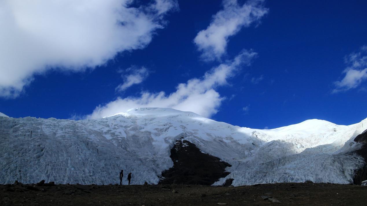 大家来到卡惹拉冰川的冰舌下,此时的海拔高度是5020米,动作稍大些,就会呼吸急促。顺着冰川向上看去是海拔7191米的乃钦康桑雪峰,高耸入云,终日白云缭绕,变幻莫测。