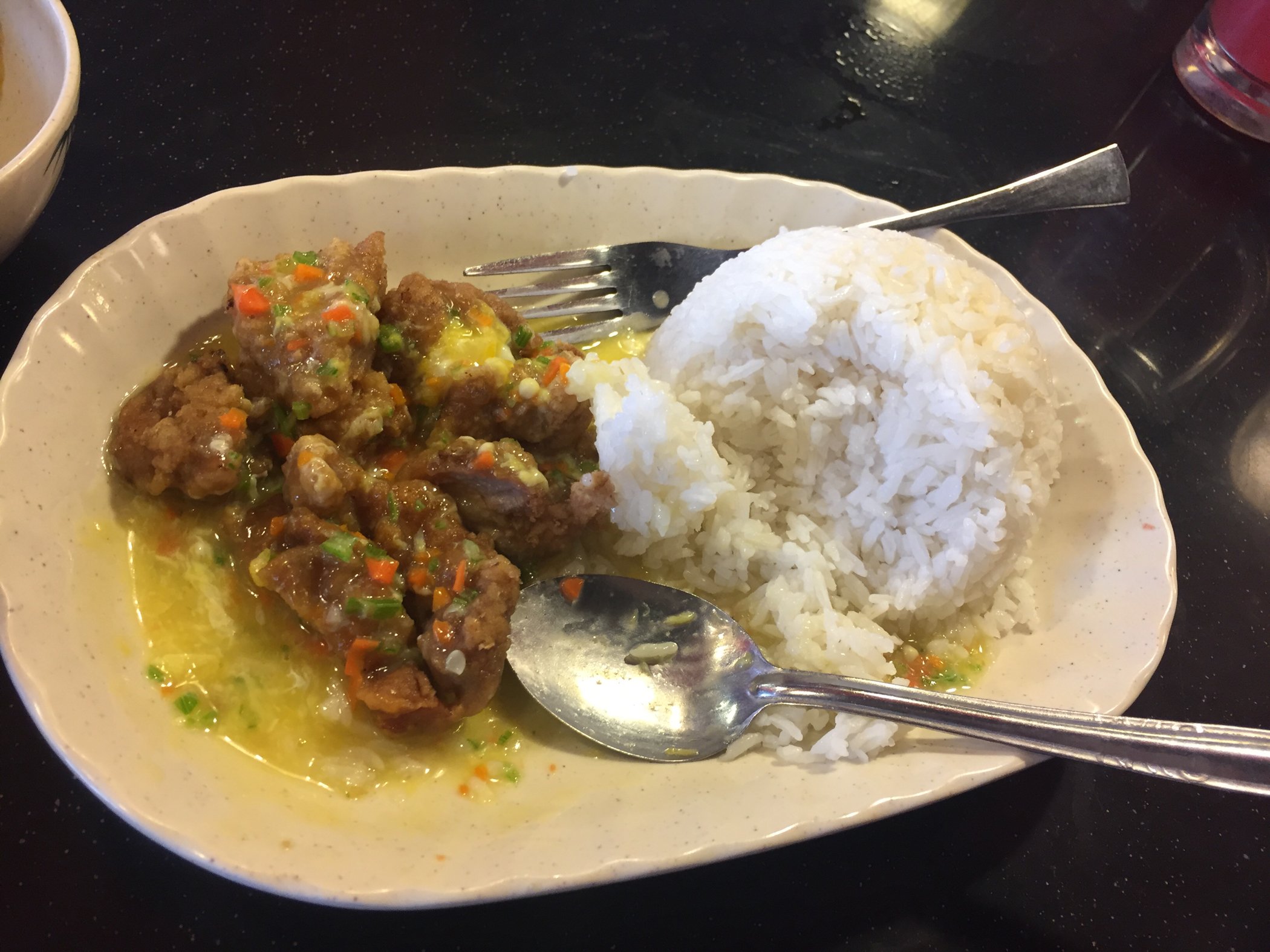 港味鸡排饭。鸡排的味道奇怪,可能是实现腌制过,不大会吃。