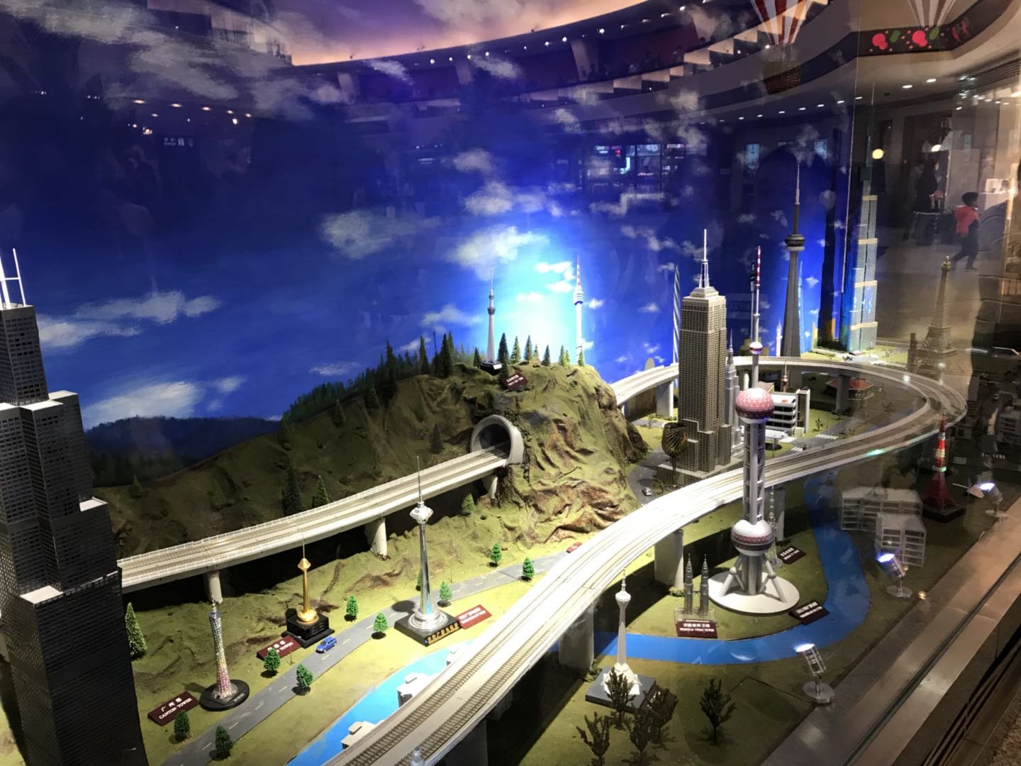博物馆门口的,与东方明珠同类建筑汇集的缩小版,动车是会动的。