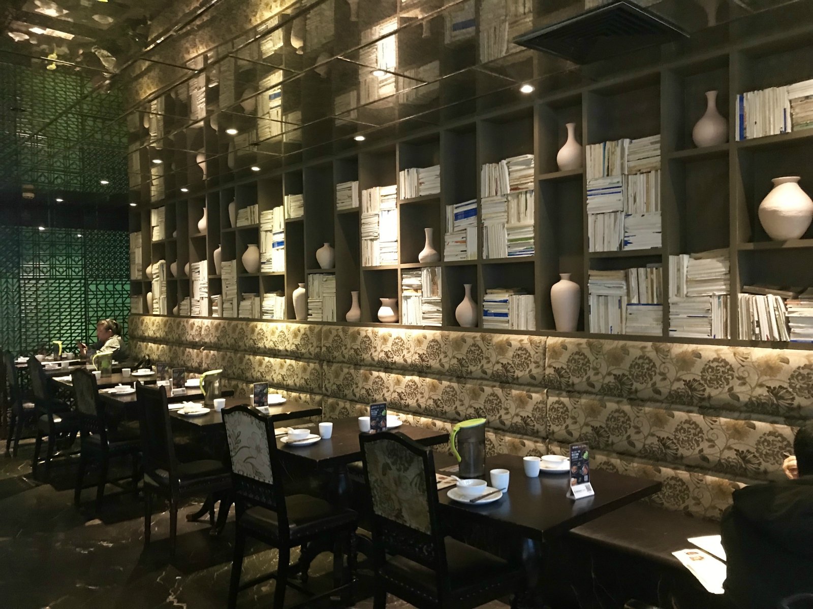 和同学在绿茶餐厅(崇文门新世界店)午餐,不是周末,十一点开餐时食客不多。餐厅面积很大,很多沙发椅,也有长条桌和圆桌,环境有南方特色。特别是墙面画GREEN TEA和满墙的藏书,陶罐有点文化腔调。