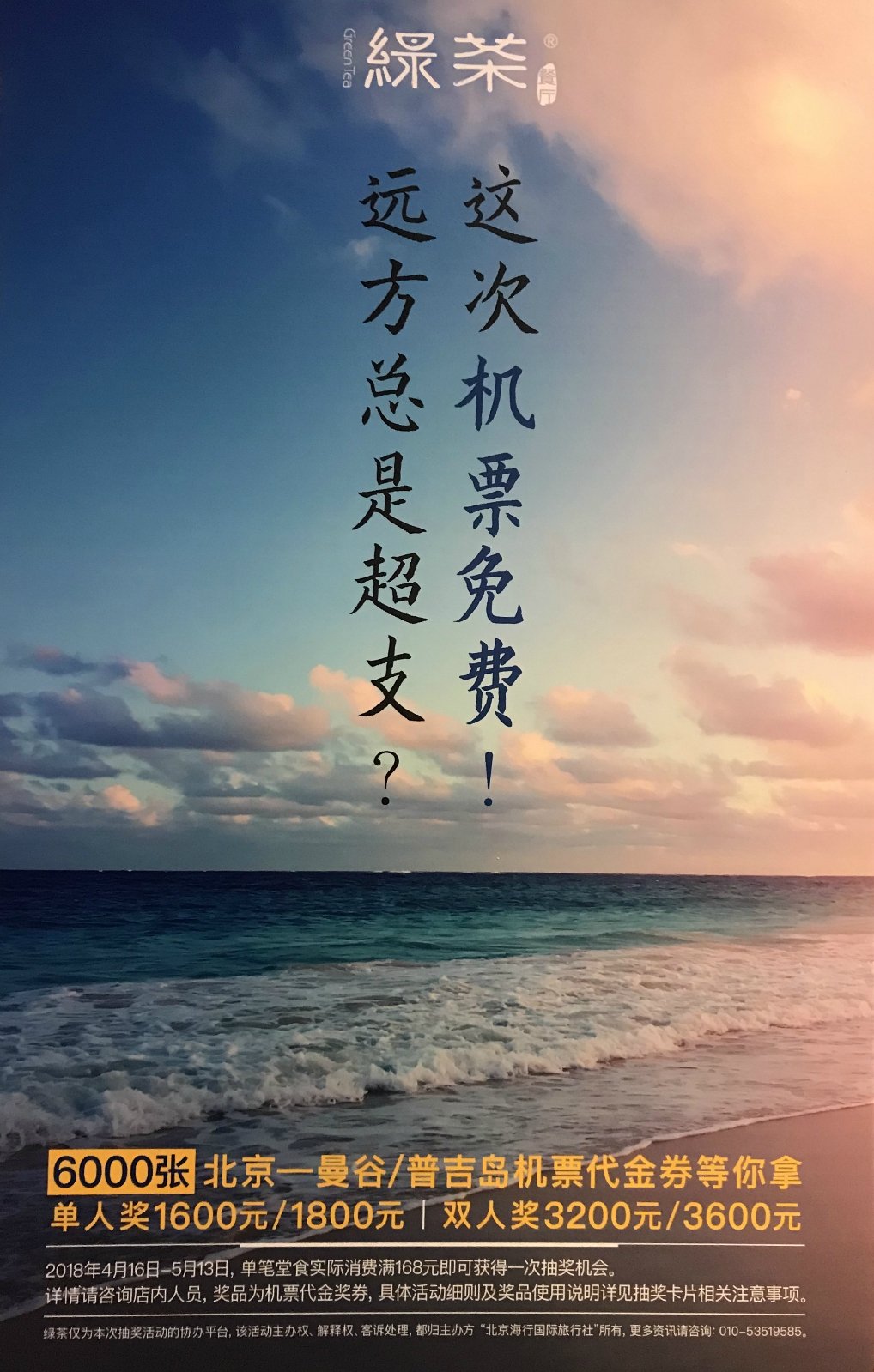 相比较前几年在杭州和北京的绿茶餐厅用餐,感觉菜单上新品多了,很多是川菜,福建特产佛跳墙也有了。原来感觉绿茶菜品适合年轻人,有的菜名很时髦,现在也多了一些大众菜。今天用餐后同学都认为菜的量,卖相及口味感觉不如以前。有的菜端上来,盘子周围挂着汤汁,石锅装的鸡汤豆腐量只有半锅,量很小,豆泥基本是淀粉糊糊,青豆味儿很淡。