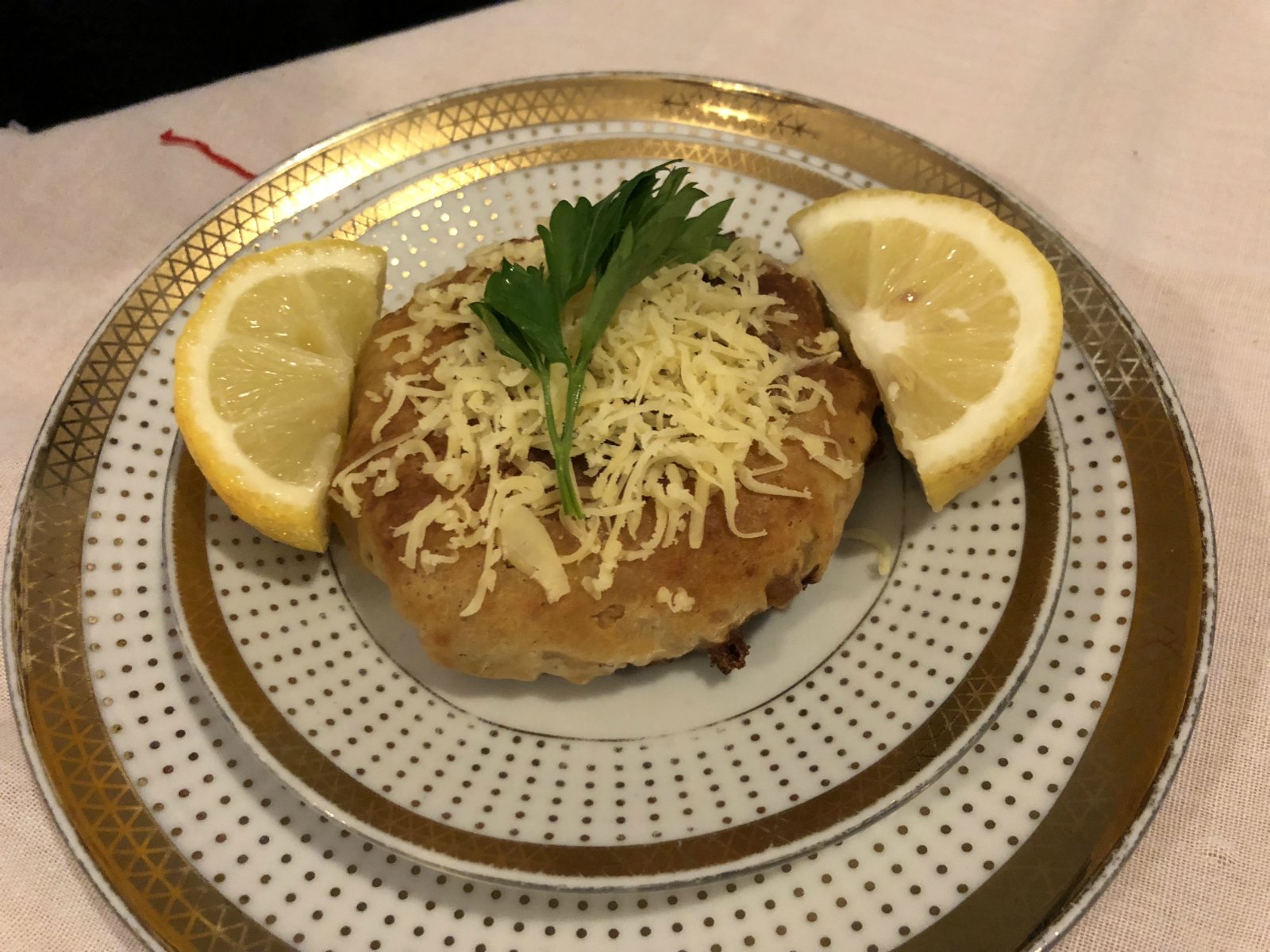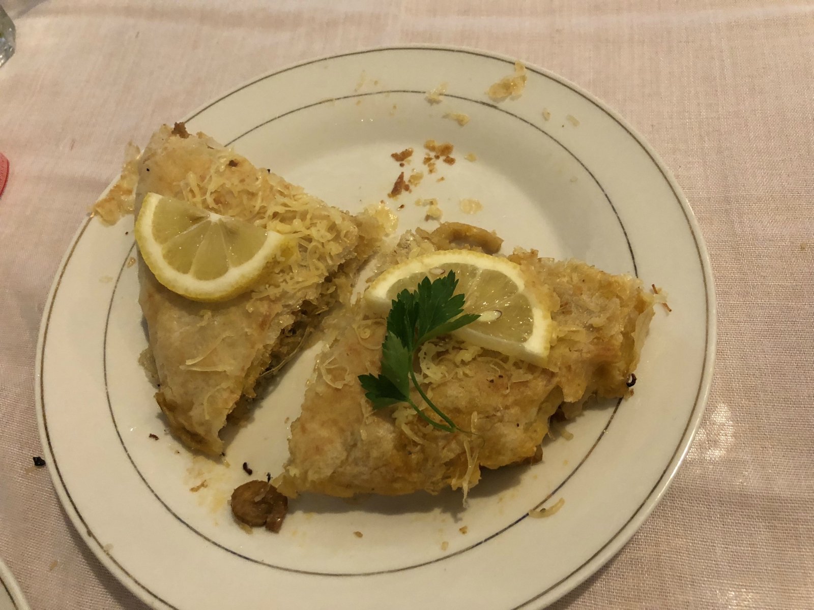 小鱼饼的外皮被炸的脆脆的,上面还撒了一些奶酪丝。因为是鱼的内馅,所以提供了切块柠檬,挤在鱼饼上来去腥。