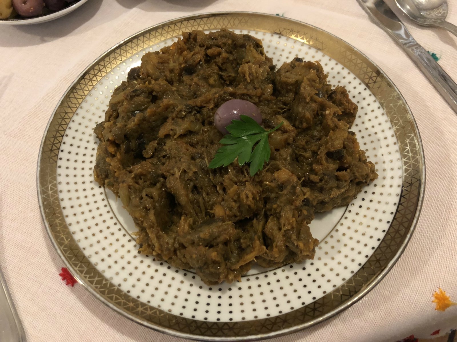 茄子去皮煮成了泥装,本身就带一点咸味和蒜香,喜欢吃辣的小伙伴可以自己再加一些辣椒酱。茄子的香味被完全释放,口感还超级顺滑。老少咸宜。而且作为整体偏淡的摩洛哥菜,这道菜能出现中国菜的咸度,优秀到要为它起立鼓掌!