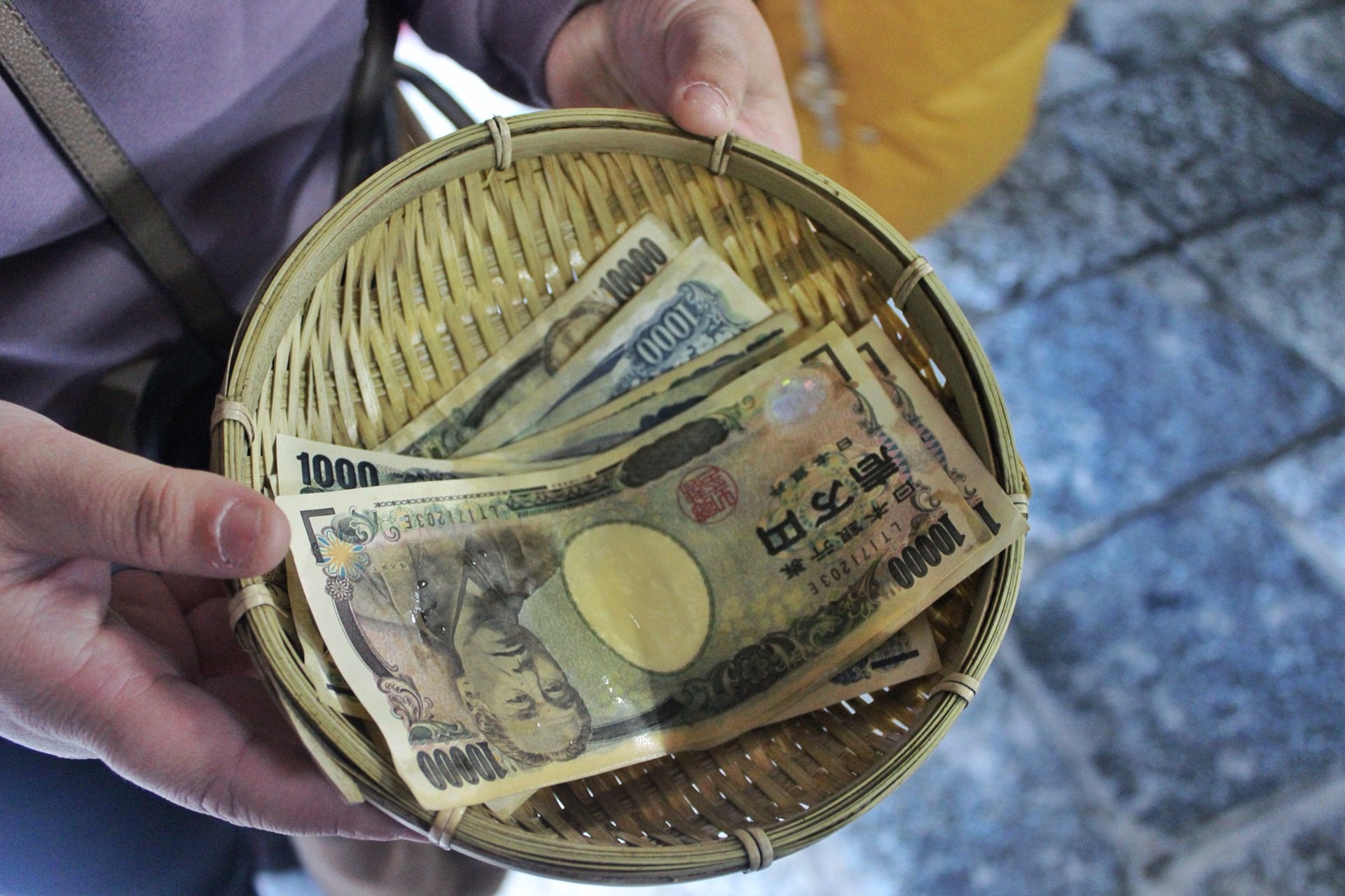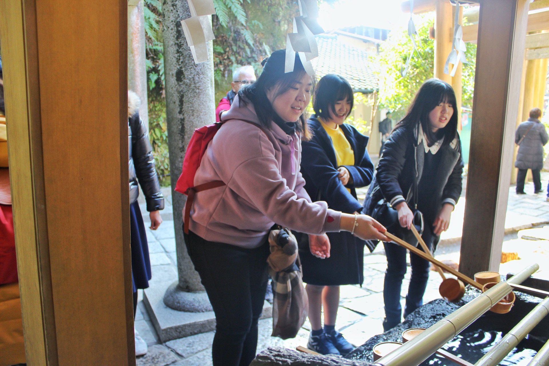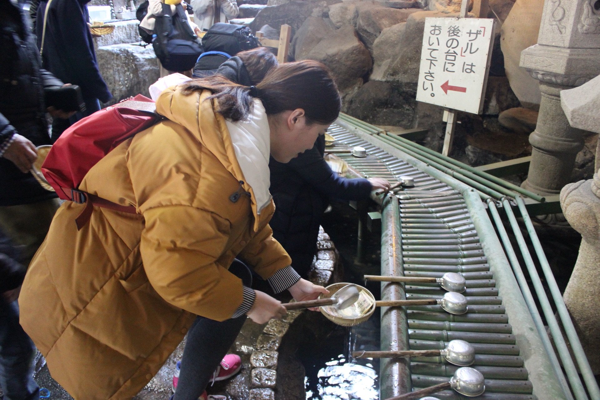 然后100円买个篮子,给了两支香,先去拜一下。这就是洗钱的地方,上到80岁,下到3岁都来了。洗完出来已经三点了,我们就准备回去了