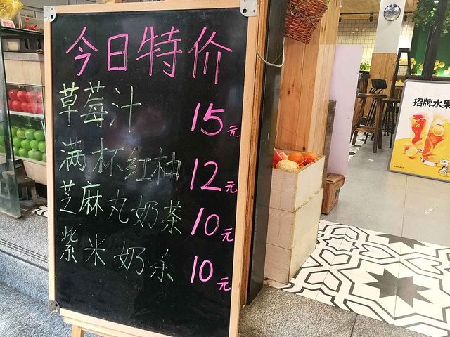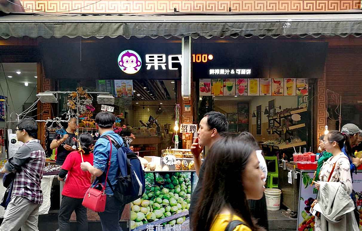 在回民街上,要说什么饮品最好喝?可能很多人来了之后只喝过酸梅汤,所以当问到他这个问题,他会告诉我没有什么好喝的,你们那里酸梅汤很难喝等等,其实在回民街上还是有一些小众而且又有格调的店铺,今天给大家探店的这家店就很不错,名字叫作【果氏100】 店铺位于回民街正街与西羊市的接口处,这里是西羊市门坊脚下,很明显的一个大标志,而且交通也很方便,不管你是从北大街这个方向过来,还是直接从钟鼓楼这边过来,或者说西大街过来,都可以到达这里,因为刚好这里是整个回访的一个中心点,而且距离回坊的牌楼也只有30米左右的距离,过去拍个游客照打卡也是非常方便。 店门口和一些普通的店铺一样,也设立了酸梅汤、石榴汁在,但是在正门外还有一个招牌上面写着每日特价,我看了一下,特价做下来就是15块左右一杯,这样的价格说实话还是有点贵,但转念一想是在回民街上瞬间就觉得这个价格很实惠呢~ 进店之后右手边是一些小商品,这个店特价做得很便宜,五块钱一个随意挑换,所以你自己可以选择一个喜欢的东西,买回去做小礼品。再往里就是一个用餐区域环境很不错,比起其他的那些店铺脏乱差的样子,这里算是一方净土了,而且最重要的是在这里你还可以用餐,店内有更多的饮品,价格普遍在15到28块钱之间,口感还是做得很不错的,也是鲜榨果汁你可以看着他现场操作,喜欢的话可以买上一杯坐这里休息一下再玩 对了,店里的无线网速度非常快哦~