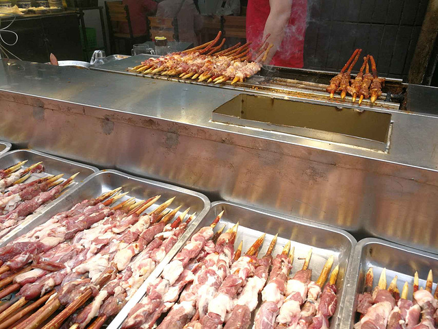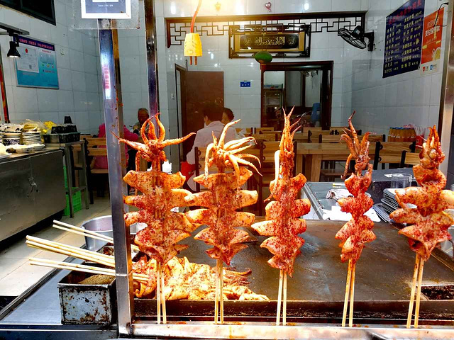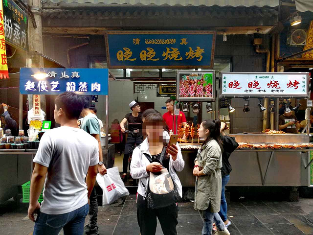 西安回民街上烧烤是主力军,不管是在哪一条街上都能看到一家挨着一家的烤摊,但这些烤摊都是烤羊肉串卖,顶多就是打个广告告诉大家自己家用的是红柳木等等(事实证明用不用红柳木味道都一样,不会说用这个木棍子就好吃一点)唯有这家【晓晓烧烤】别具一格,真正的做成了烧烤店大排档,可以说回坊仅此一家。 具体位置在西羊市的中段,说实话关注小羊的朋友会发现我对于西羊市的美食写得有好几个,你也就明白回坊好吃的大多在西羊市这边,正街说白了就是地理位置好背靠鼓楼有个人气罢了,好吃的没有几个,就连以前的网红贾三灌汤包现在也是做得一般般了 【晓晓烧烤】的正门外有两个排档,这也是回坊的一个行情,大家都会在店外摆个摊摊卖吃的,方便不想麻烦去进店的顾客。这家店正门左边是一家【粉蒸肉夹馍】,粉蒸肉夹馍也是回民街上一道不错的美食,蒸好的羊肉肥而不腻,加上粉子里面的充足调料,夹在馍馍里面,再淋上一点秘制调料,一口咬下去口齿留香,而且才十元钱一份,在这个片区来说并不算贵。另一边就是烧烤摊了,最低十元起步,羊肉串、牛肉串是十块钱也是最便宜的,其他如烤鱼、羊排等就是好几十一份,另外烤全羊、烤鱼、烤蔬菜都是时令价,大家吃之前记得先问好价格,避免被坑。店里还有轰炸大鱿鱼,不过我建议各位不要购买,首先是不新鲜,吃了容易闹肚子,整个回民街的鱿鱼都是这个样子,其次是味道也不好吃,他家店最好吃的其实是鸡翅和羊肉串,可以买上一点尝一下。 店内面积不大,卫生做得一般,这个也是回民街上大多商铺的问题,不太注意餐厅卫生,脏脏的臭臭的老板还觉得很正常,服务态度一般,特别是烧烤这里那男的,说话很凶,不太舒服~ 最后来一张图,让大家看一下回民街的人山人海,五一来的注意了,每年都要挤爆