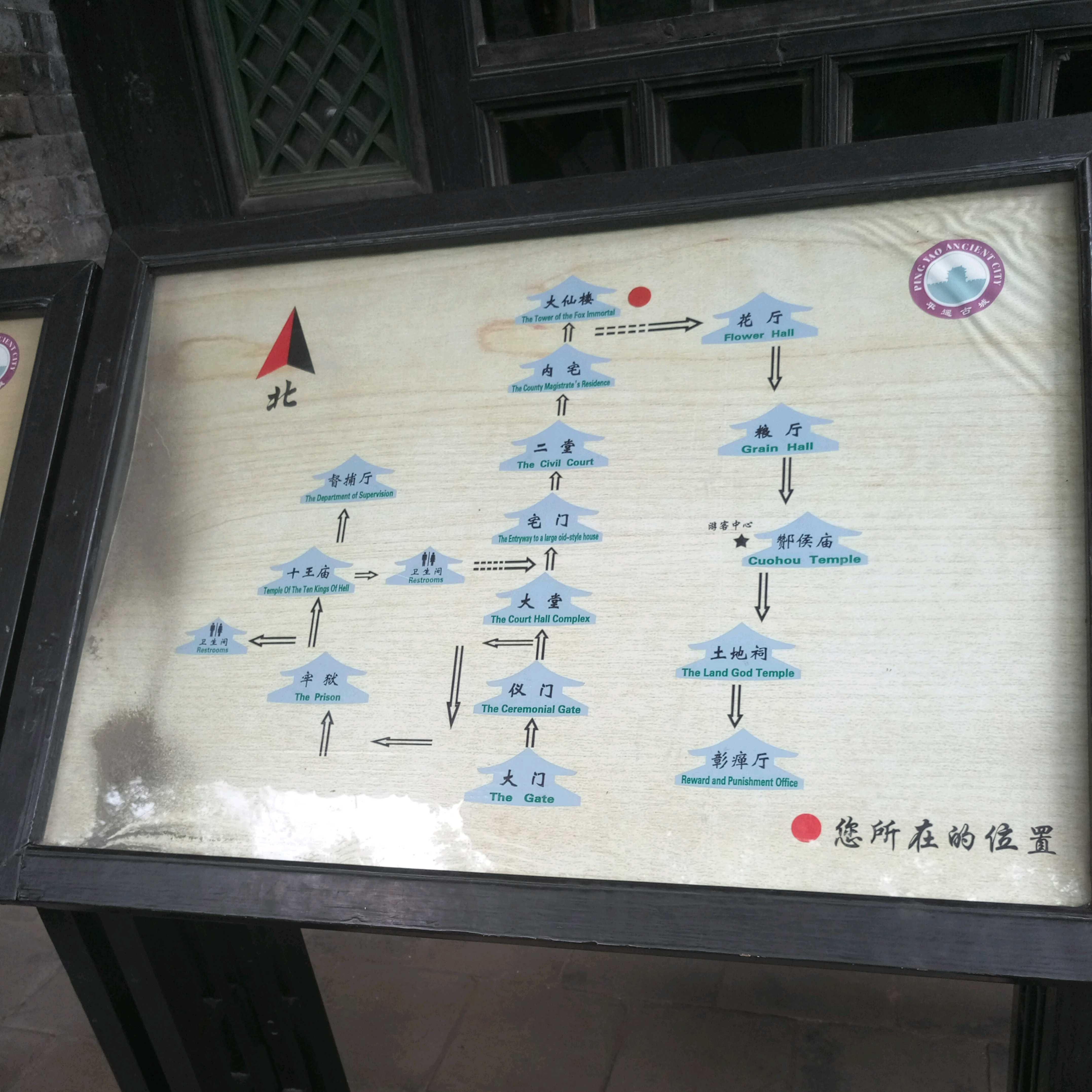 一早醒来,已经是八点了。出门和领队吃饭聊天的过程中,经营客栈的老大爷还送给了我一份平遥地图。按照地图,婷婷、黄丽盈我们很快就来到了县衙门口。还没过多久,就开始了县衙升堂表演,因为游客众多,升堂表演没有在亲民堂(大堂)内表演,而是在大堂外的阶梯之上,方便游客观赏。表演演的是一个卖猪肉的草民状告县衙捕快偷自己的钱,经过核实,县令革去了捕快的官职。演出台词诙谐幽默,让人忍俊不禁。演出之后,我们又参观了县衙的二堂、内宅、大仙楼,还有牢狱。其间,有不少清代历史人文知识,了解起来,很有意思。比如内宅平时只有县老爷一个人住,因为清代规定县令是不得携带家眷的;大仙楼位于内宅之后,整个县衙的最深处建筑,竟然在二楼供奉着保护官印的狐仙……