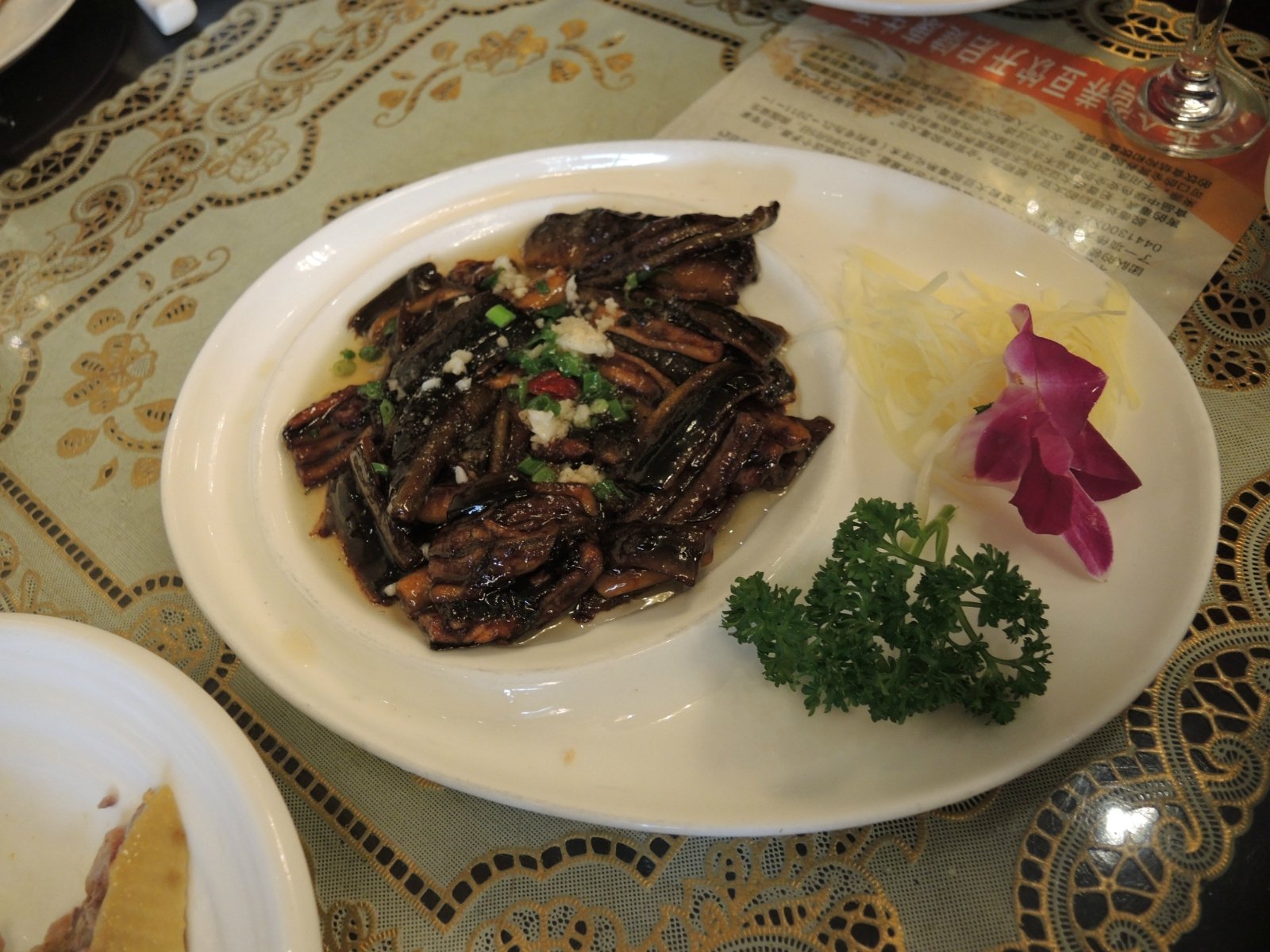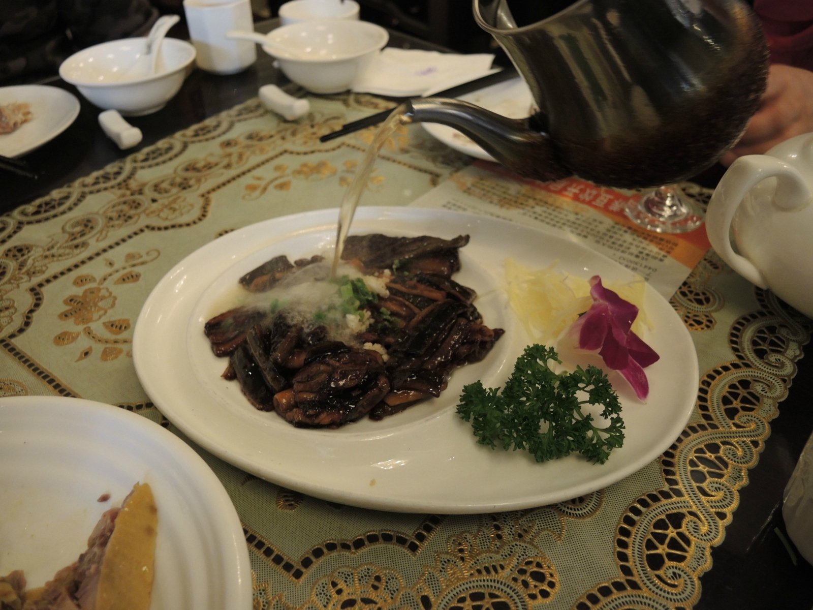 响油鳝糊。您要问昨天你们不是刚刚吃过了吗,怎么还点呀?吃不够吗?这就得说姐姐的心思缜密了。昨天紫檀不是在等菜时出去拍照片,结果错过了浇油时的“刺啦”声了嘛,今天再点一份给他一个“补摄”的机会。太谢谢姐姐啦。这回紫檀可是老老实实地坐在餐桌边,半步也不肯离开了。也是,这回要是再错过了,就有点太不像话了。果不其然,热菜里第一个上桌的依然是响油鳝糊,真是苏帮菜里的急先锋呀。安安静静的一盘赤酱炒就的鳝片儿,经过一壶滚烫的热油一浇,但见鳝片上油花沸腾,热气飞空,只听见耳鼓内刺刺拉拉的脆响不绝,好一派热闹欢腾的氛围呀。