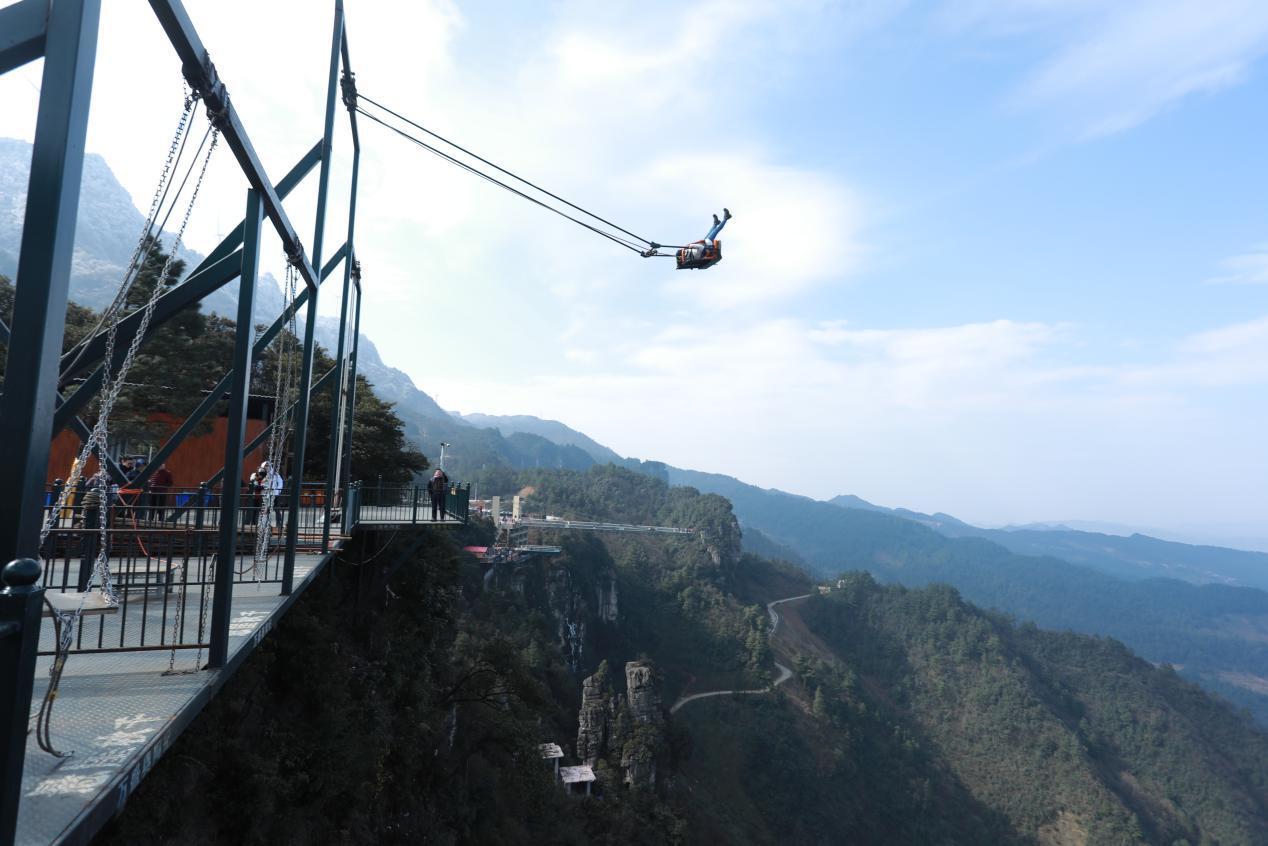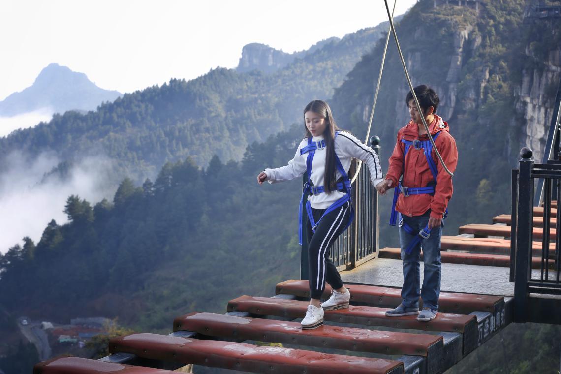 悬空于数百米高的悬崖峭壁之上,桥面铺设全透明玻璃,下面就是万丈深渊!走在上面,跟着悬廊猛抖。终于到了“尖尖处”,吹吹风、赏赏景,很惬意!