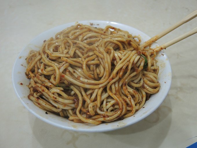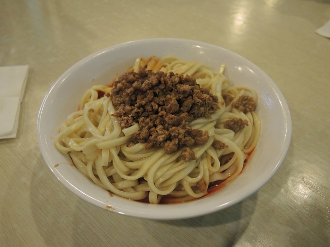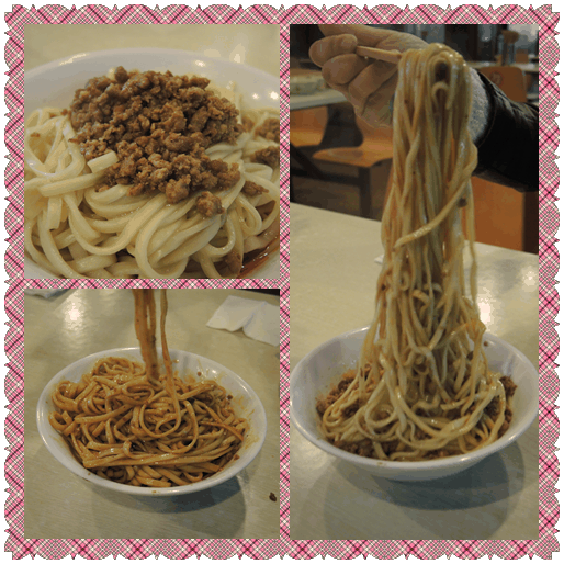 杂酱面和脆绍面完全不一样,表面上覆盖着一些很香的肉末,挑开面条,下面也埋伏着红亮亮的辣椒末炸成的辣椒油,调拌均匀后,色泽艳丽,香气扑鼻,吃起来虽然也是火辣辣的,但我们还能受得了,可能是经过这两天美味的熏陶,我们渐渐地开始适应成都的麻辣了!这碗杂酱面味道很足,香辣醇美,被我们一扫而光!