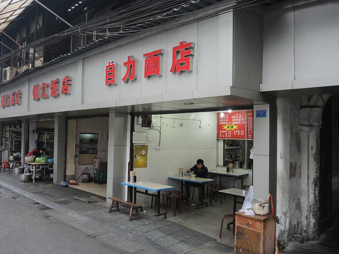这一夜睡得真是太好了,绝对的无梦到天明呀!拉开窗帘,希望中的阳光没有出现,天空依然是阴沉沉的。今天的计划是去熊猫基地看熊猫,喵喵对此十分热心,所以很兴奋地起了个大早。出门来到华兴正街,这条小小的美食街就成了我们每天吃早餐主战场了。今天早上我们打算吃面条。就在和雨田饭馆相隔几个门脸的一家小面馆吸引了我们:门脸不大,干净整齐,就是它了。