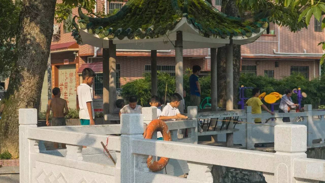 悠闲的午后,小孩子在池边钓鱼,这种老掉牙的玩乐方式,真的很老套,却比玩手机玩游戏来得更欢快。