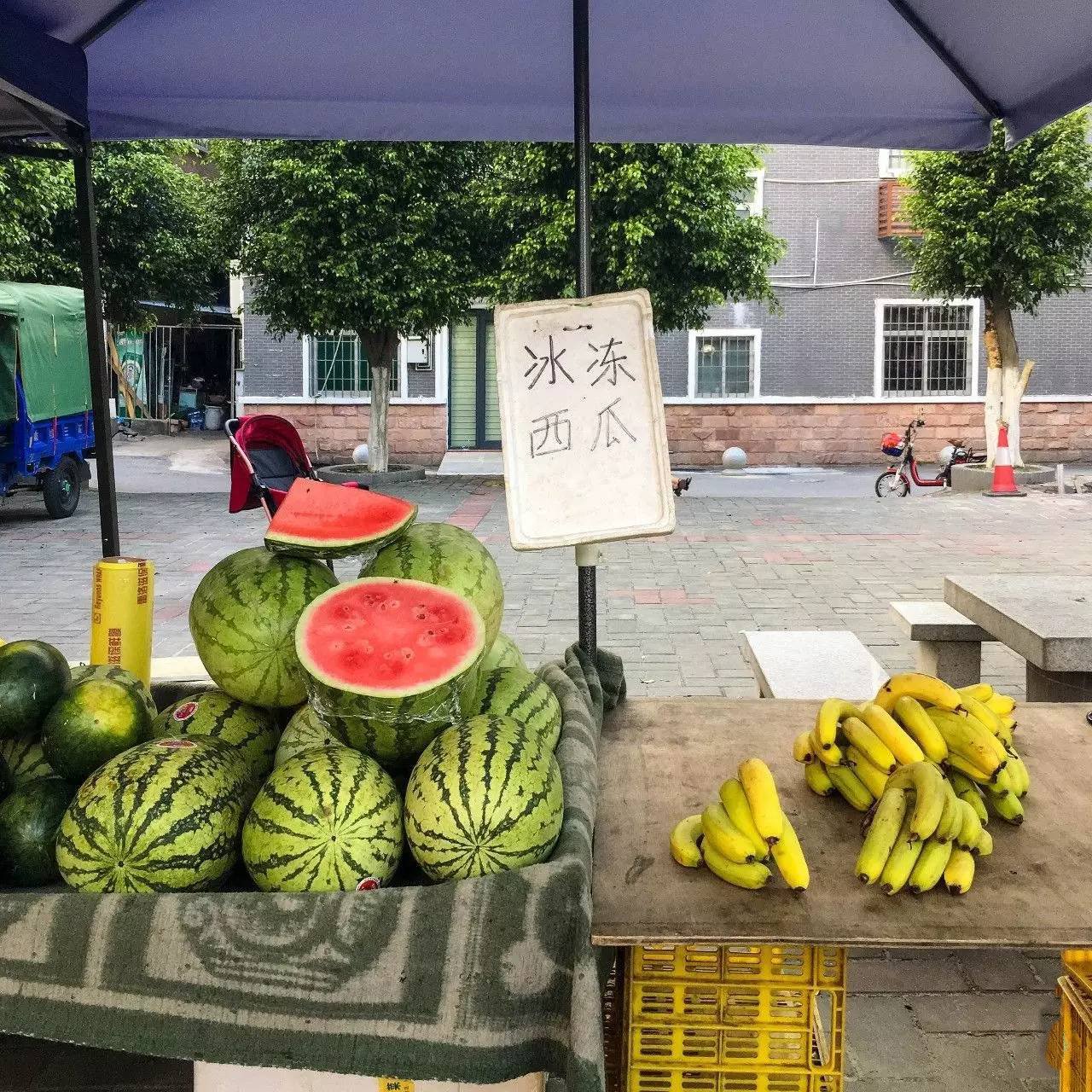 正午热辣的阳光褪去之后,这些果农就会出动集中在这条道路上卖蔬果,红红的西瓜,在这样闷热的夏天,光是看就忍不住想切上一大块来吃!