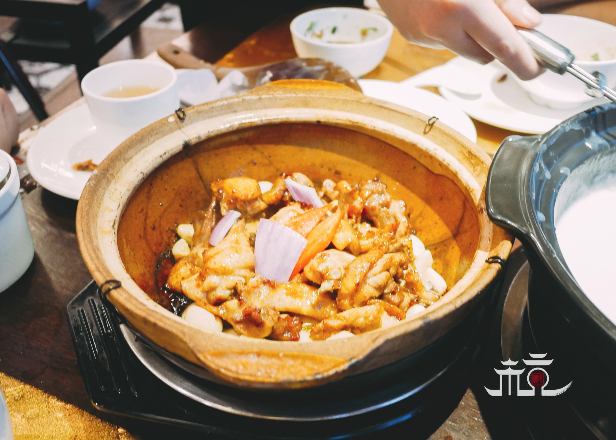 啫啫鸡,有点像三杯鸡的味道,很入味,一会就空盘了,空盘之后我们开始吃配菜了,洋葱和大蒜都好吃的不行,是嫩蒜,口感像百合,然后真正意义上的空盘了,配料都吃光。