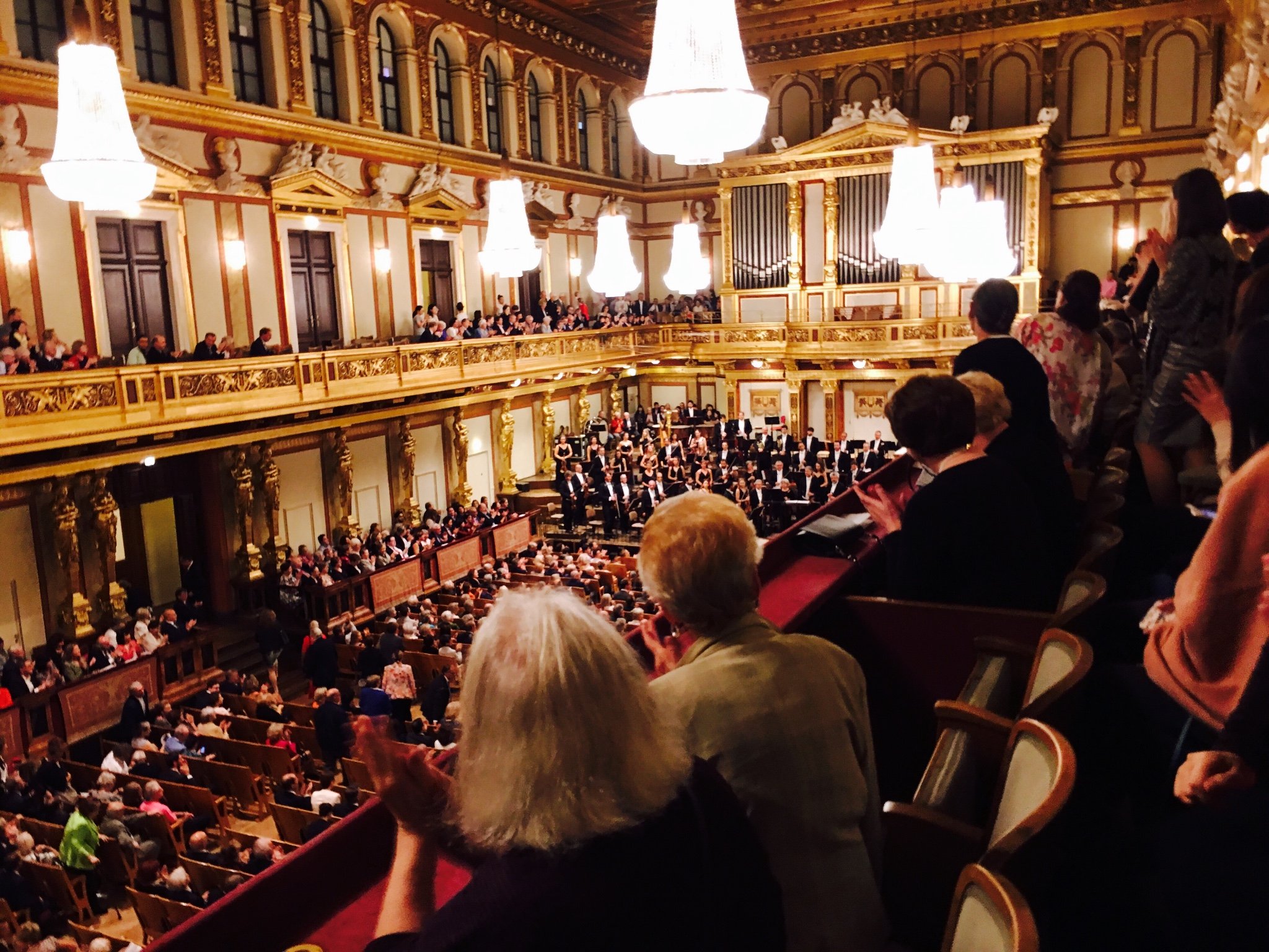 下午到达金色大厅,本来是要买晚上莫扎特演出(每晚20:15)结果给出了19:30的演出,而且给出了站票(6欧),听这么高雅的东东怎能站着?咱不差钱,随即去找工作人员换票座位票45欧每人。(分几号门、几排、几座)不同的门从不同的入口(会有工作人员指示),进入会场前包和大衣需要存起来,大概0.9欧每件。座位号直接看椅子上都有,如果不确定可以咨询工作人员。 欧洲 人比较严谨,所以不要乱座。