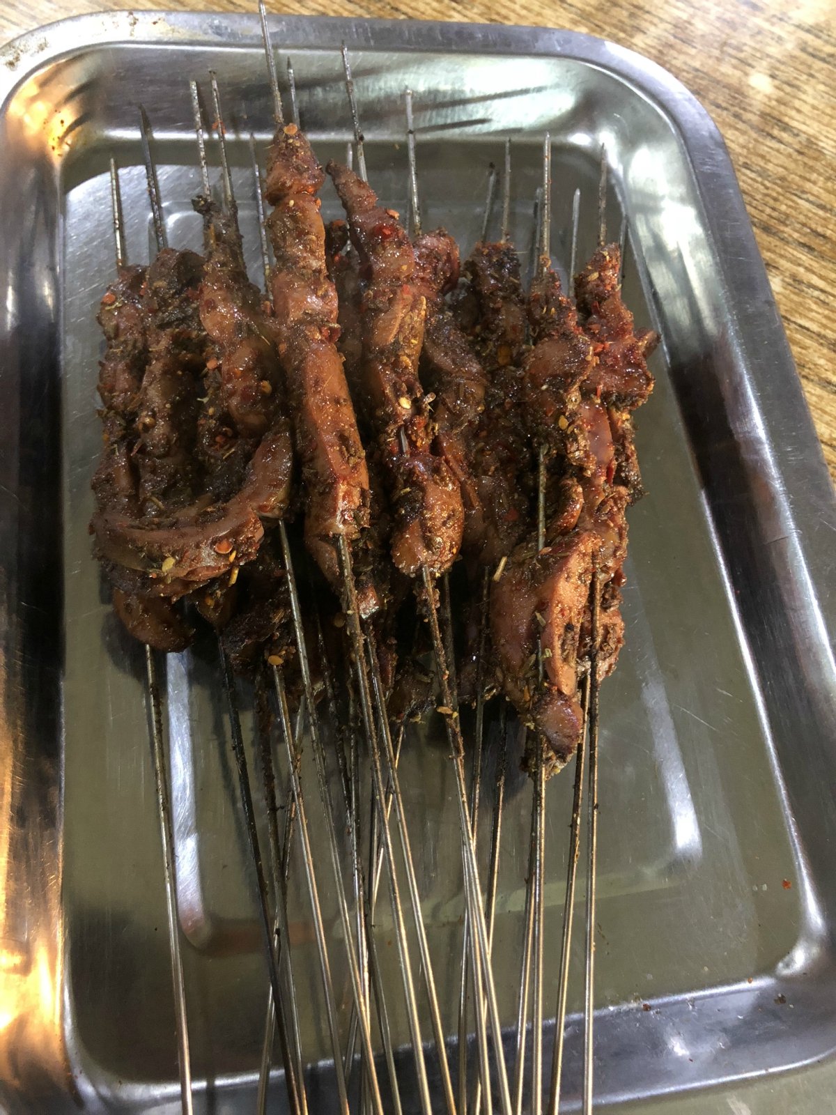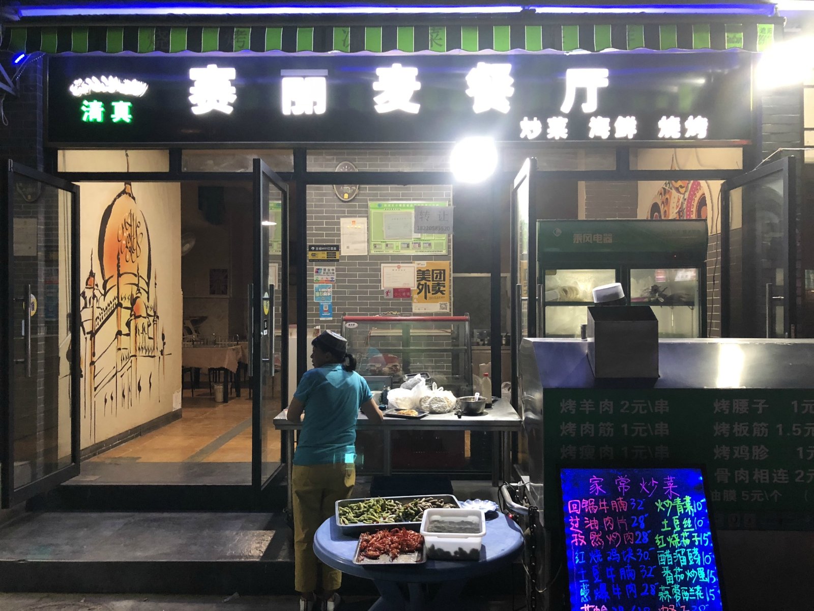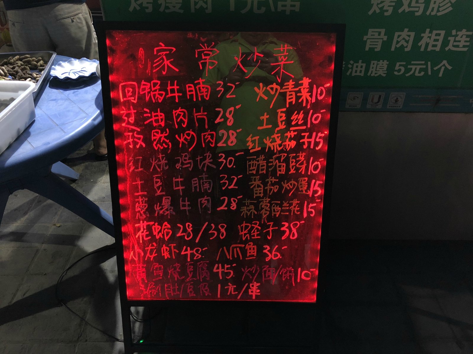 由于主要是晚上营业,这家餐厅主营各种烧烤,其次还经营有家常炒菜,炒面/炒饼,涮牛肚涮豆皮等等。烧烤的串(均是1元1串)包括有牛肉(纯瘦或者肥瘦),牛腰子,牛筋等,其次还有烤鸡翅、香肠、烤饼等(均是5元1串),一般情况下,2个人要上30个串,一个烤饼,鸡翅之类的,外带一些饮料,50元以内应该就可以吃饱。如果不想在店里用餐,还可以用烤肉夹馍直接带走(一般可以夹15-20串肉)。他们家的炒菜,包含孜然炒肉,土豆丝,红烧茄子等家常炒菜,除此以外也有花蛤,蛏子,小龙虾,黄鱼等海鲜炒菜,推荐他们家的黄鱼烧豆腐,45元一份,红烧方式制成,味道略微有些发甜,嫩豆腐蘸着汤汁吃着刚刚好,非常的鲜。