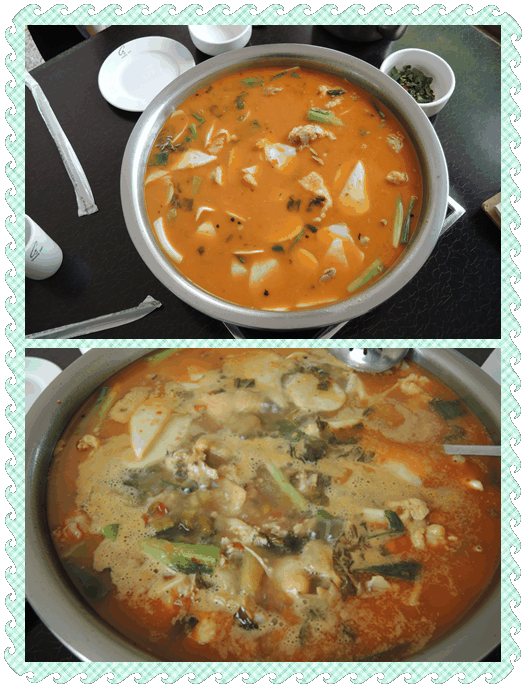 蜷着腿窝坐在低矮的小墩子上,感觉很不得劲儿,无可奈何地对视一眼,苦笑了一下,唉!好在店里上菜的速度还挺快,等了将近十分钟,一个大火锅就端上了桌,一股诱人的酸香味引得我们口水汹涌,锅开了三分钟后,我们挥箸大嚼,倒也十分过瘾。可能是因为饥饿作祟,我们一开始吃得还算舒坦,到后来就觉得越吃越咸,越吃越酸,难以入喉了。结果鸡肉还是没有吃完,就算撑得肚圆了,依然浪费了一些边边角角。虽然这是我们最不愿意看到的结果,但真的是无可奈何了!