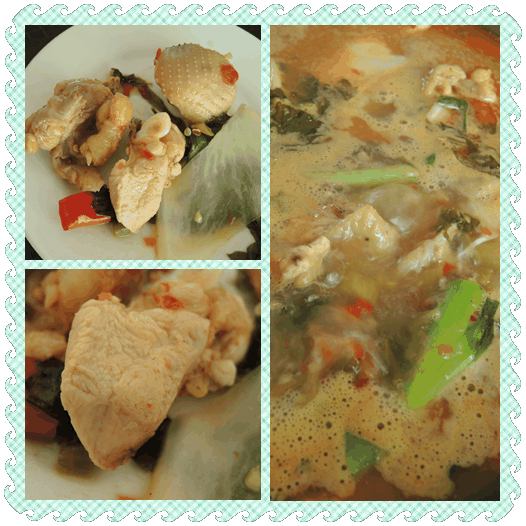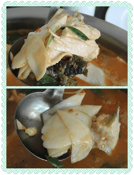 鸡肉和酸萝卜看着颜色清淡,可咸味之重却绝对是“不可貌相”的呀!酸萝卜,酸溜溜的味道极其浓郁,到了“午宴”的“下半场”几乎难以入口——太酸了!这道火锅最突出的味道就是又咸又酸,哦不,应该是“太咸太酸”!真的比重庆火锅之麻辣还考验人的味蕾呀!绝对不符合健康饮食的标准。