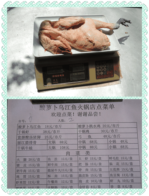 我们点的最小的半只鸡,居然也有三斤半之重!大理的鸡大都是白身子的乌脚鸡,肉质挺嫩的。附上菜单半幅,我们点的“酸萝卜跳水鸡”稳坐第二把交椅,价格不算太贵。