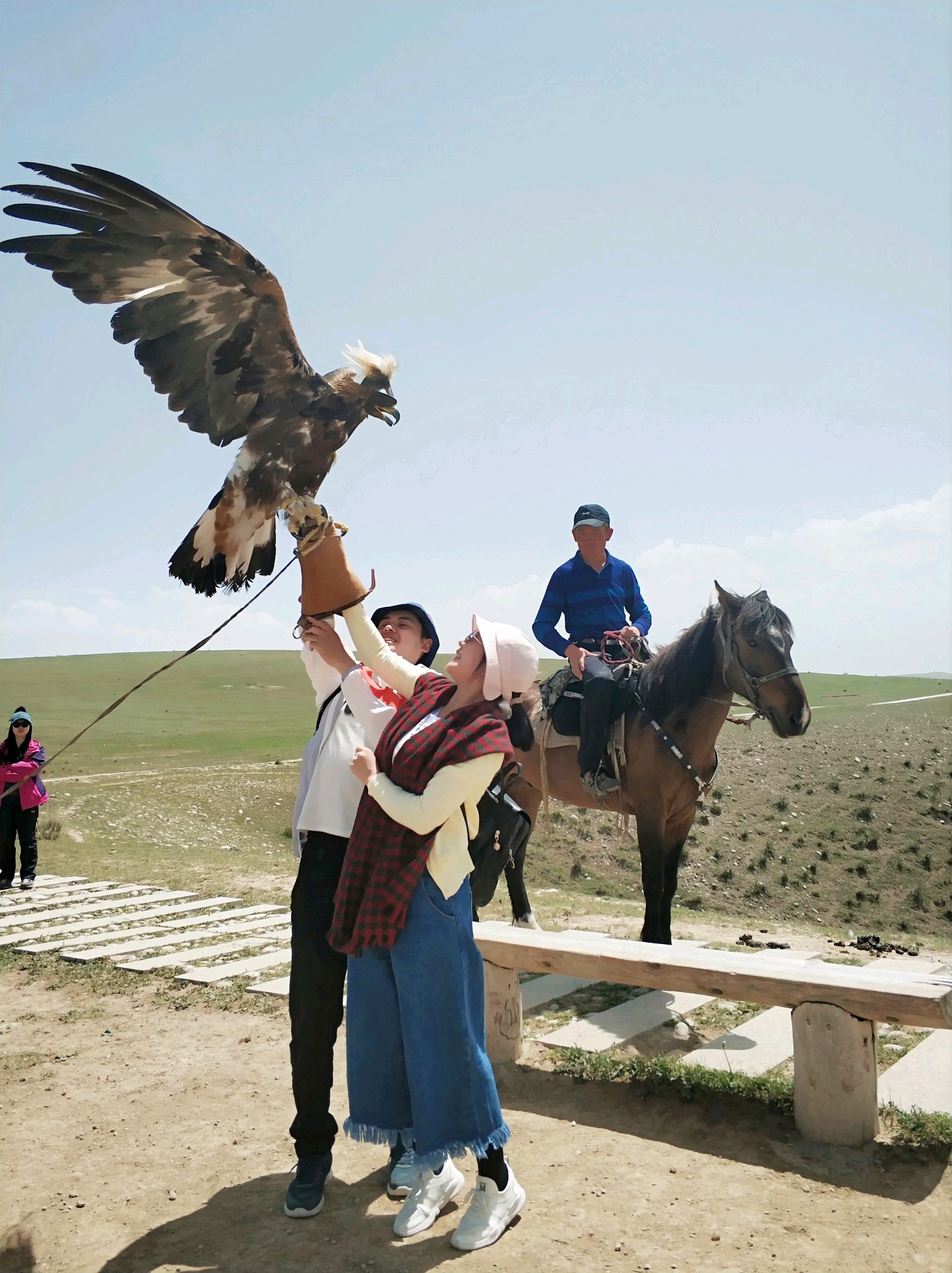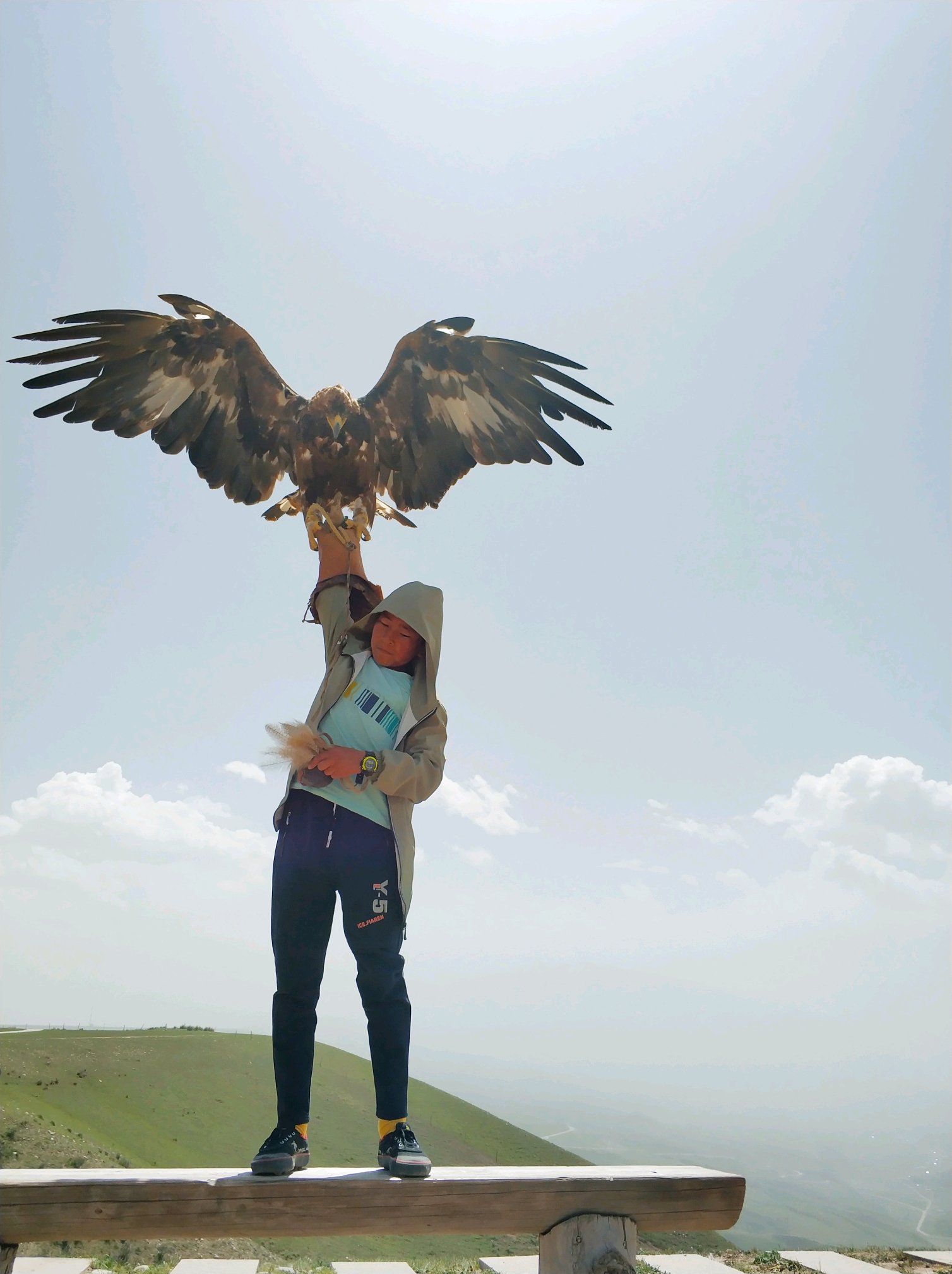一个小男孩养的雕拍照20,摘眼罩后拍30,两岁差不多20多斤,每天要吃4斤肉。想要让它张开翅膀,还是要花点力气,很显然我们都没吃饭。