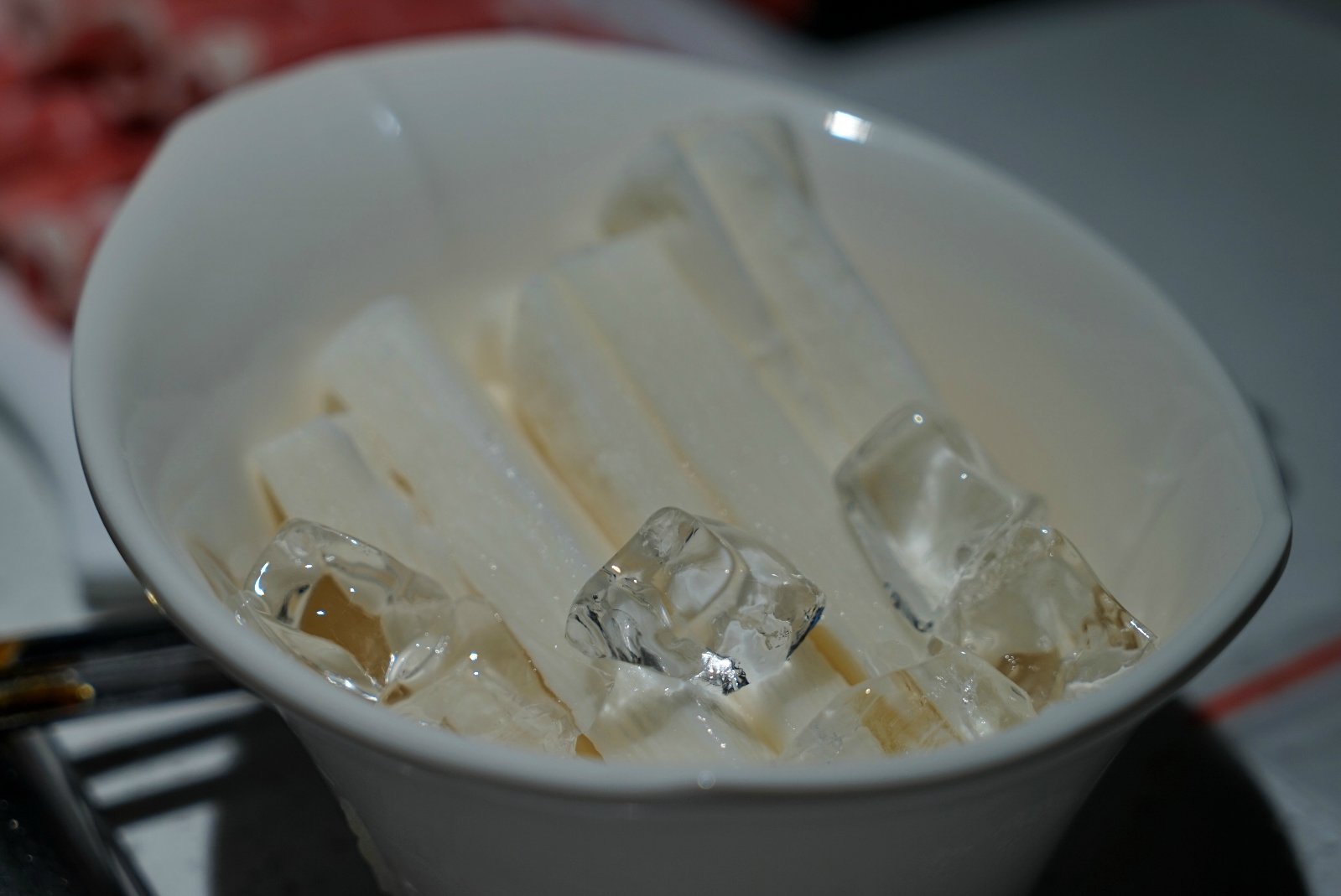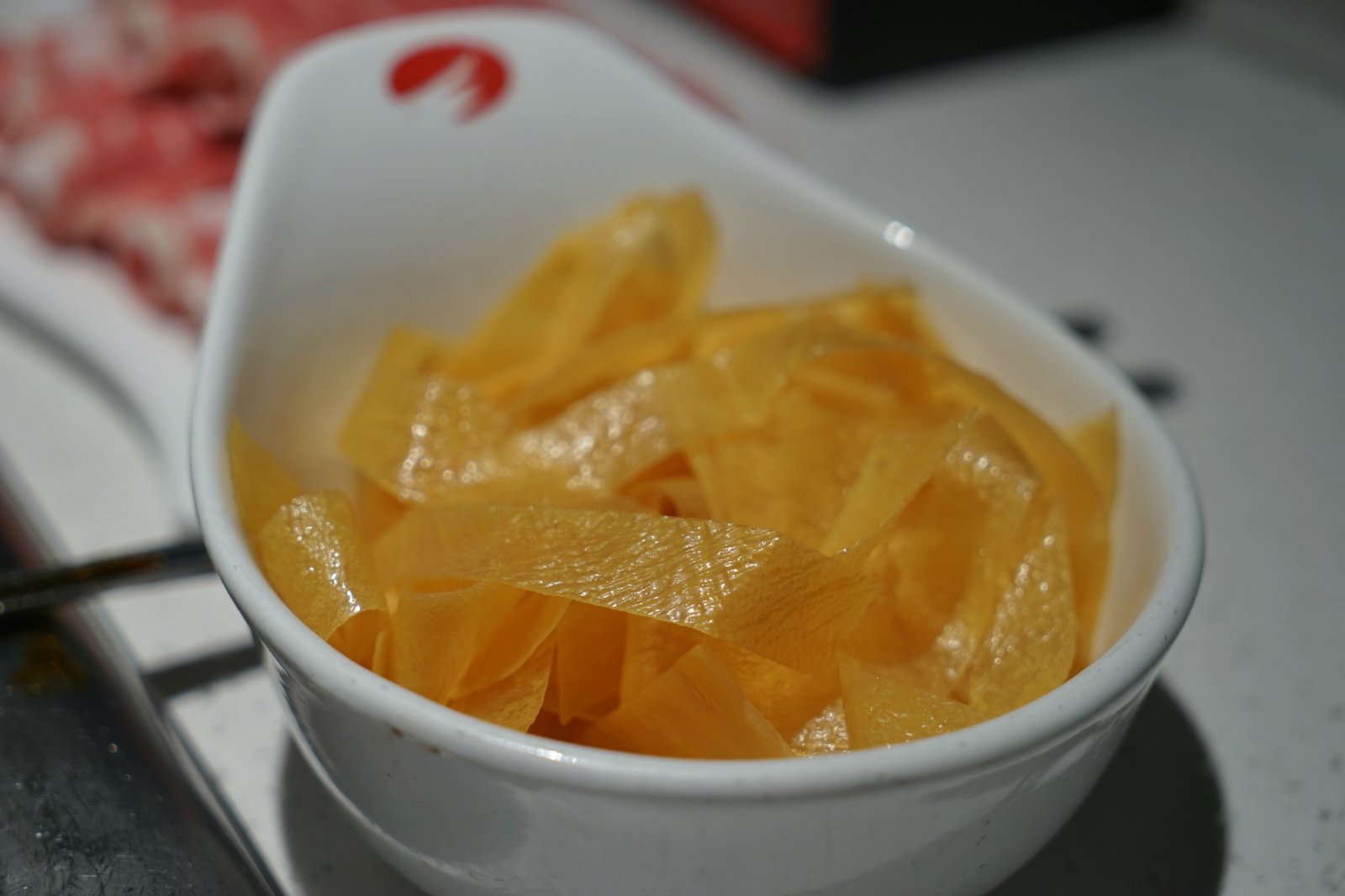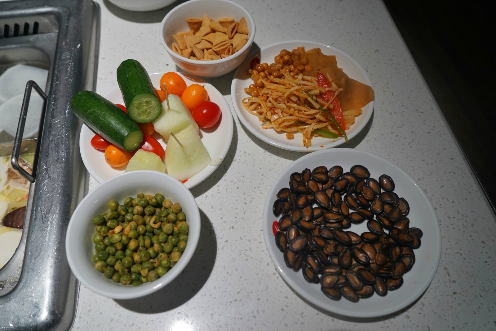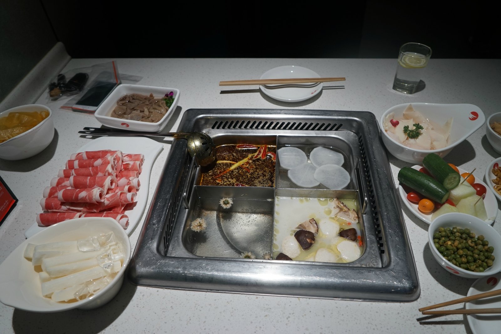周内的中午过来的,所以不用等位,直接用餐。如果是周内晚餐或者是周末的时候过来,一定是逃不了排队这件事的。两个人用餐,点了两个锅,剩下的两个店员烧了白开水,放进菊花和蔬菜点缀,也不会显得太过于单调。等餐的时候,从调料区,拿了些小吃,一边聊天一边等着上餐。