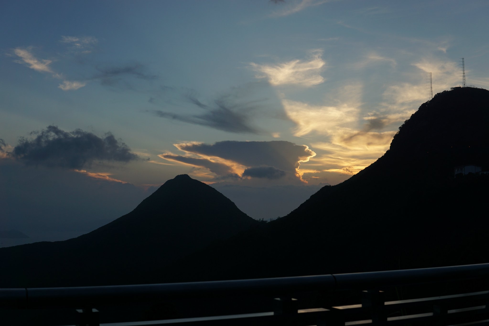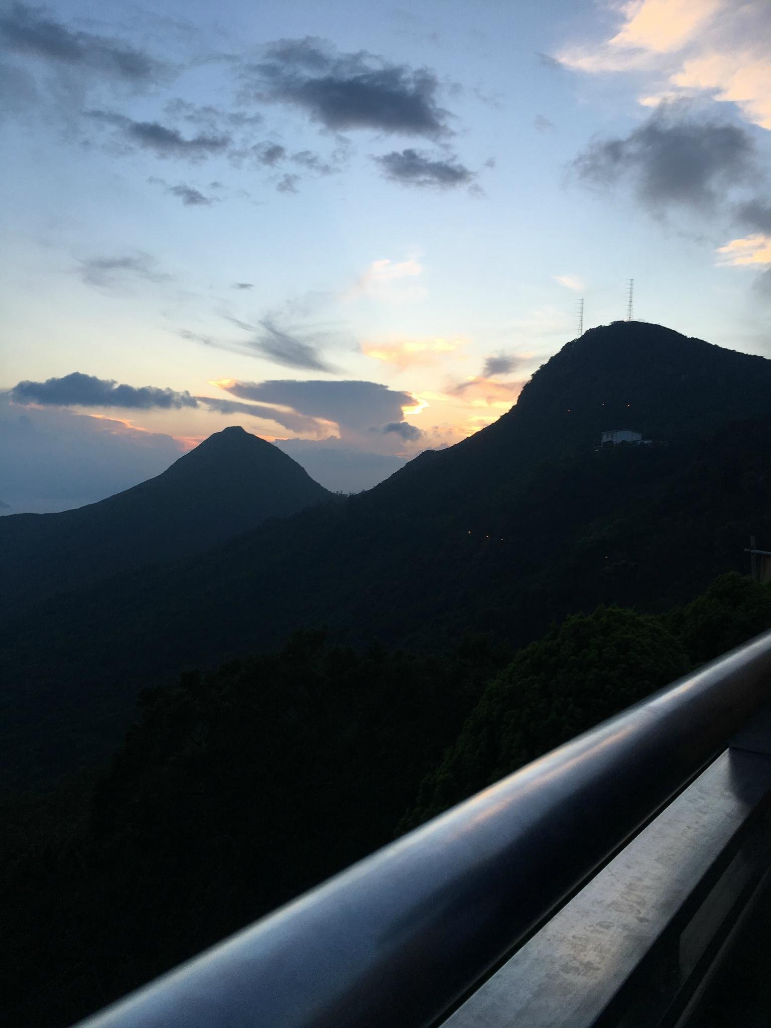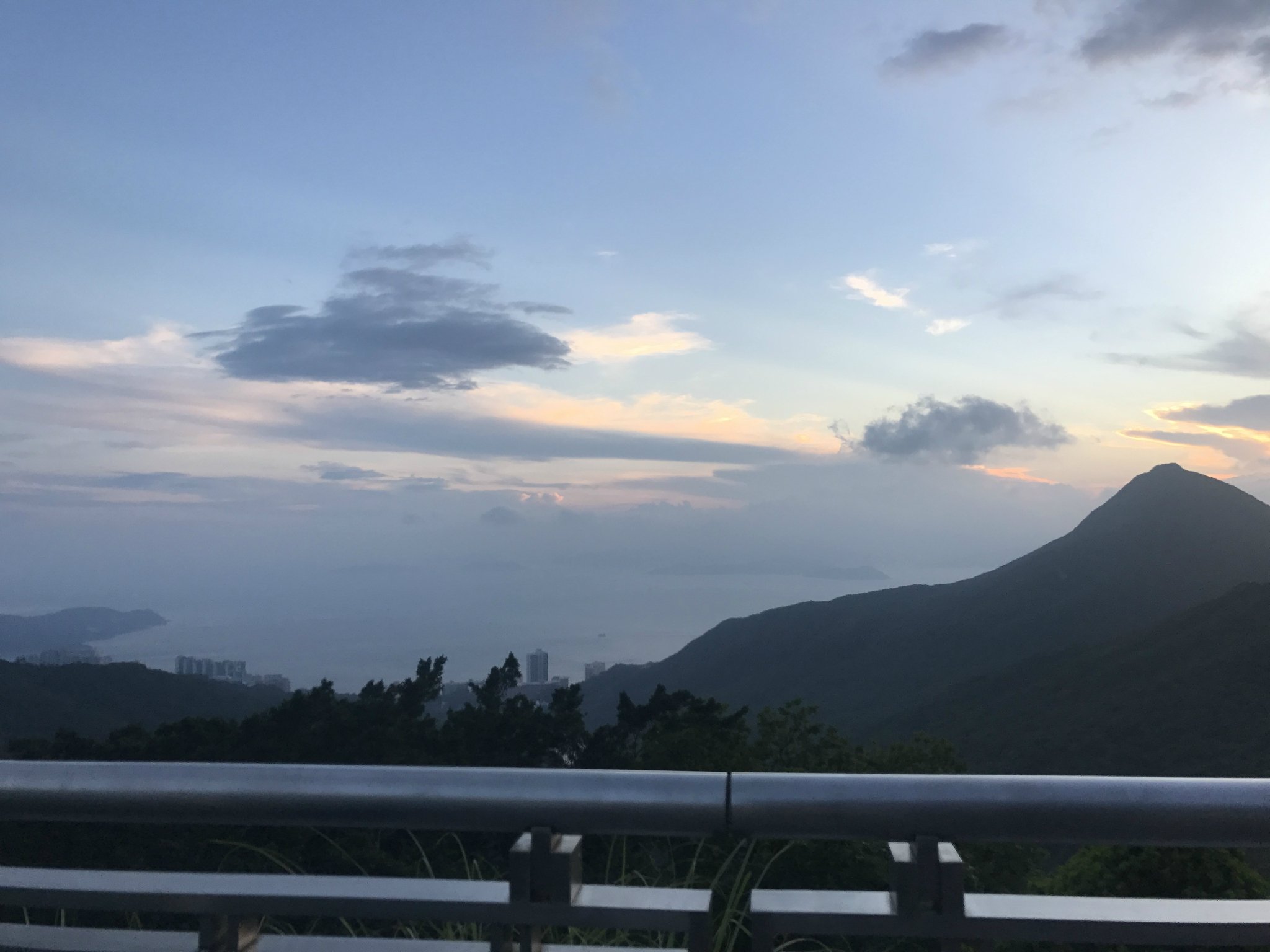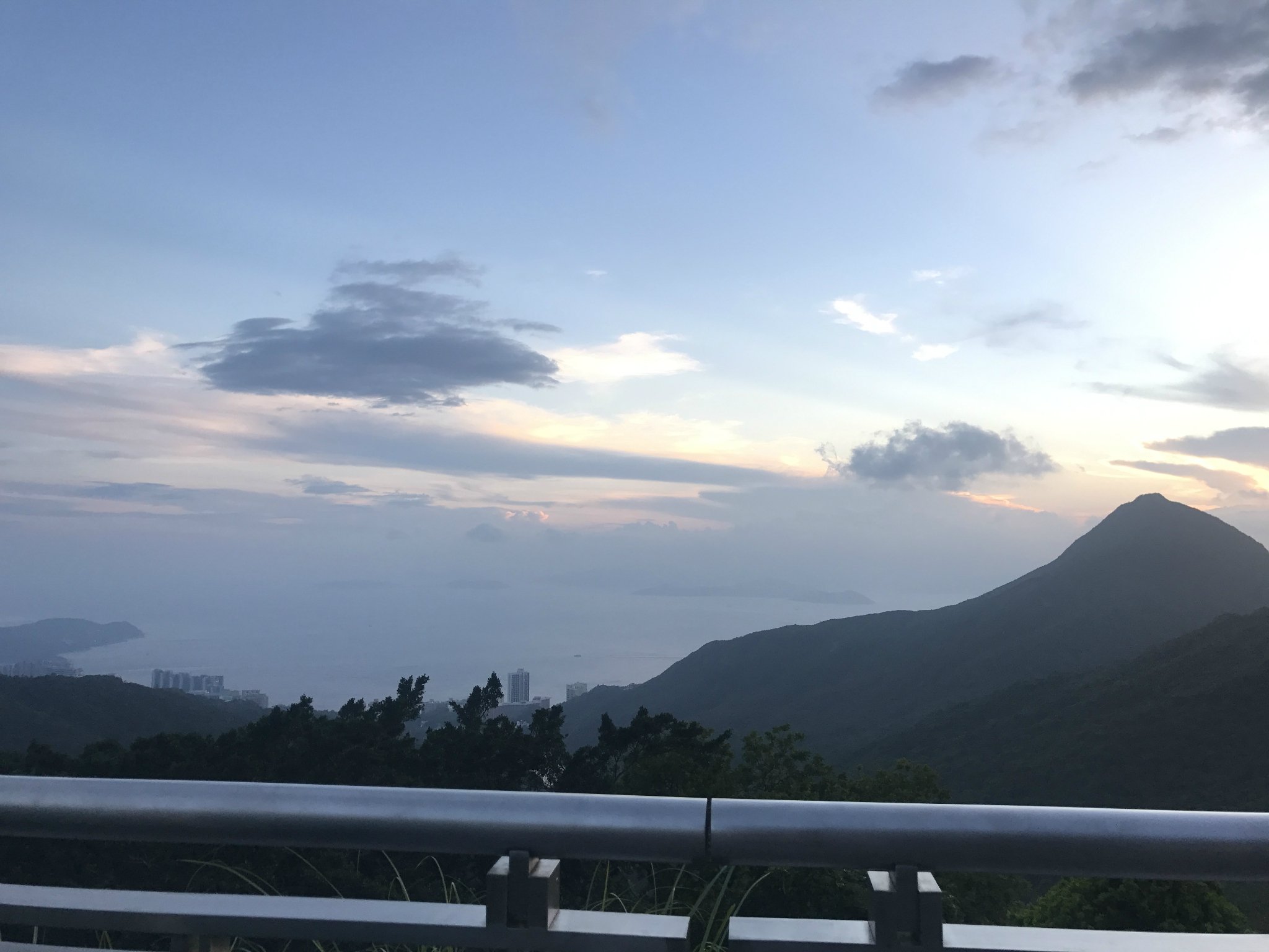 下了公交就是山顶广场,有上厕所和吃饭的地方,那里还有个小平台,能看到一丢丢的日落风景。彼时太阳准备下山了,可惜我们没有赶上最好的时间。我们在这里吃麦当劳,一个套餐是45港元,然后我们两人吃了两个派,一个汉堡一份鸡翅鸡腿72港元,在景区算是很良心了。