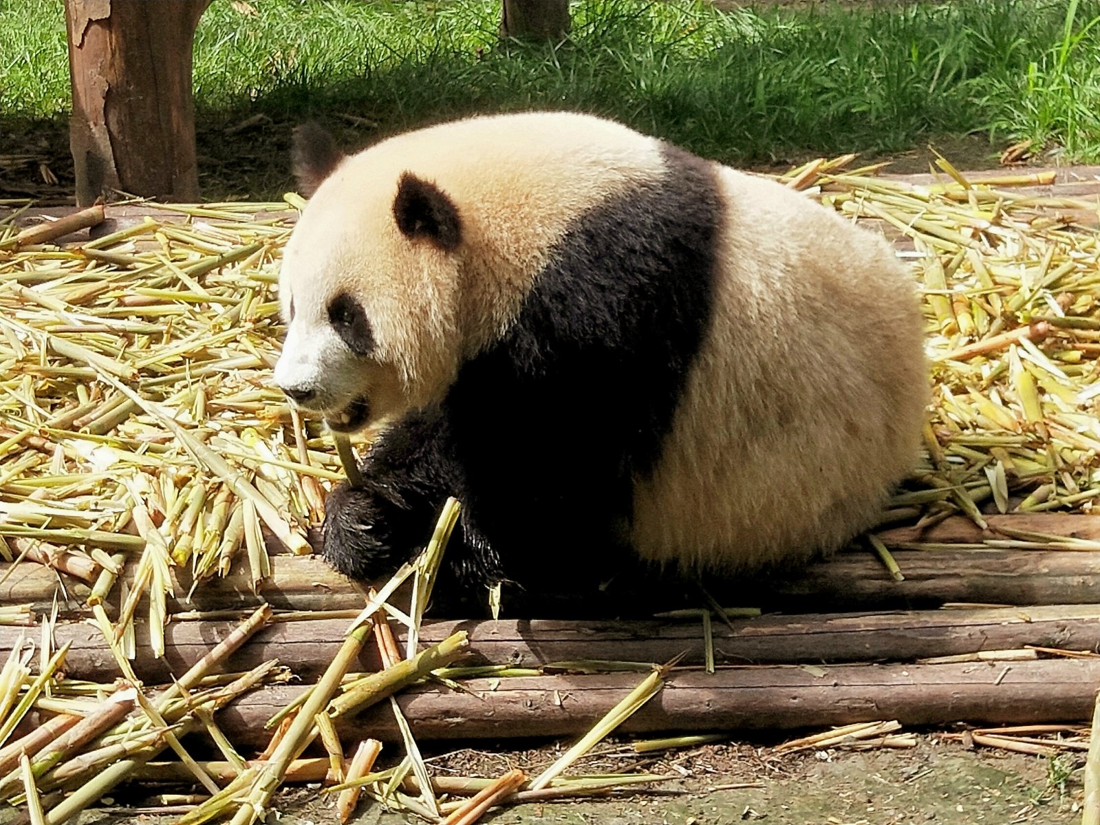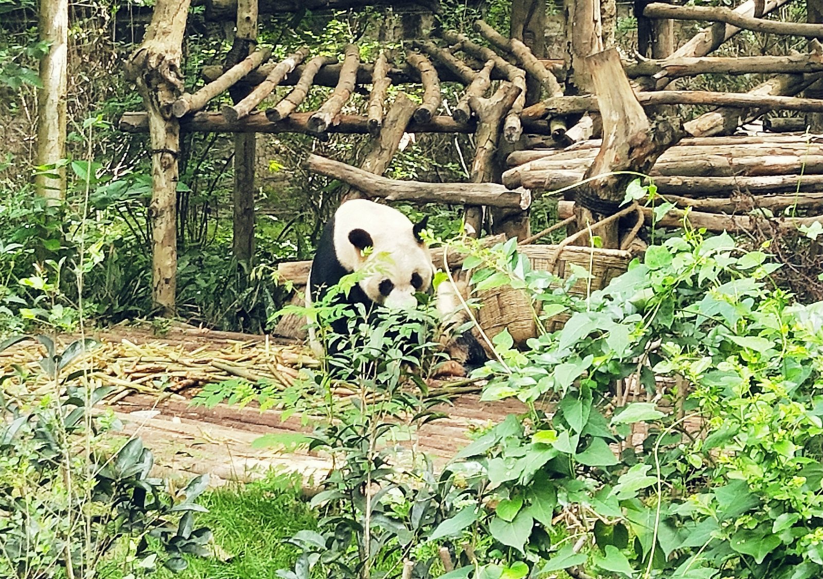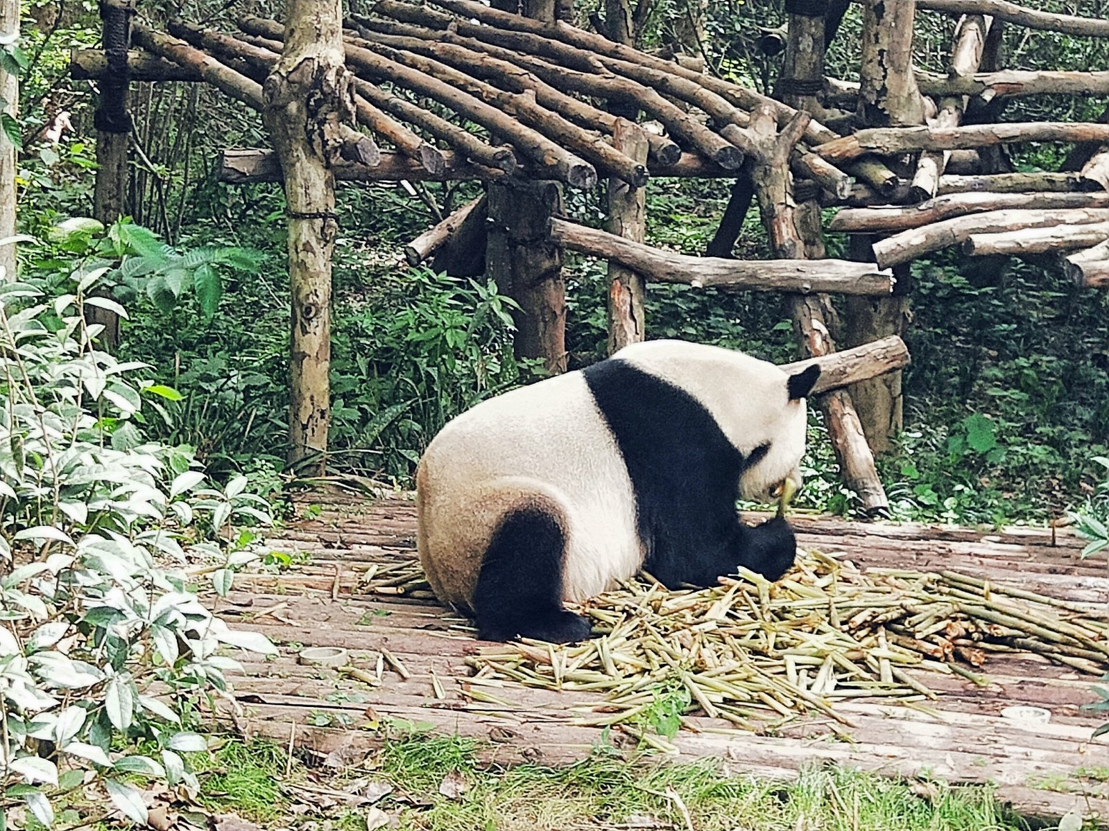 完全这只的萌呆嫌弃了,一直悠然自得吃竹子,本等着它吃完竹子的回眸一笑,没料想人家吃完竹子直接甩过来一屁股对着游客们拉粑粑,然后坦荡荡的走上木架挠痒痒,完了径直走到树荫下躺下打呼呼去了,哈哈。