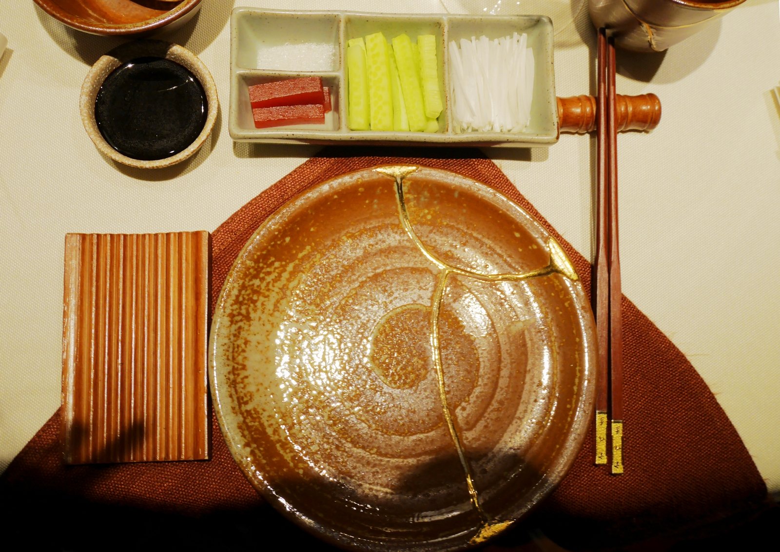 盘子很特别,复古又精致,桌面有些不够用的感觉。