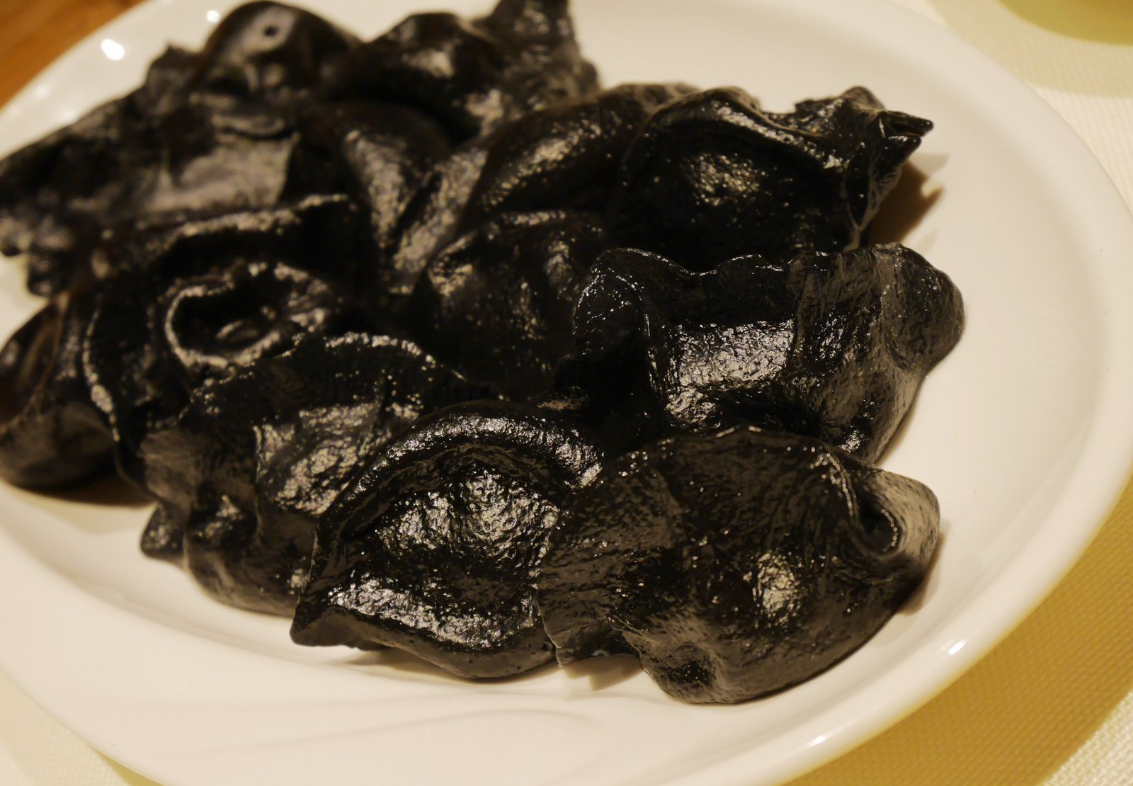 墨鱼水饺,用墨鱼汁和面,饺子里面是肉跟墨鱼配馅,38好像,味道很好。