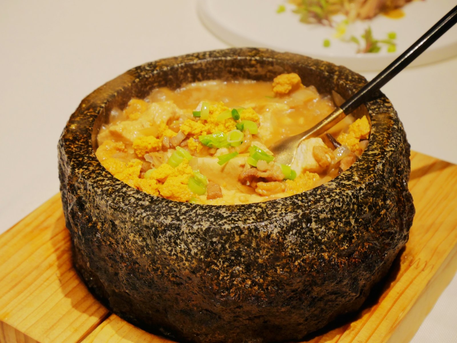 海胆豆腐,平时在家会做这个菜,不过没这个好吃,这个石锅的版本还加了五花肉在里面就更香。