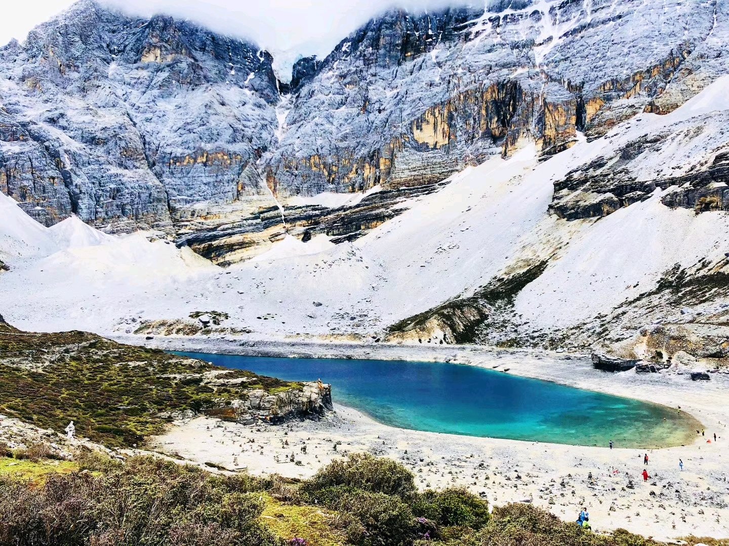 从牛奶海到五色海只有600米,来回半个小时,所以到了牛奶海一定要去五色海,要不然很亏。五色海其实没有牛奶海的水蓝,天气不晴好没有阳光反射出湖水的五种色彩。五色海位于仙乃日与央迈勇之间,海拔4700米,湖面呈圆形。面积0.7公顷,现代冰谷下伸至湖畔,雪山倒映湖面,呈现奇幻的色彩。是藏区著名的圣湖,据传能“返演历史,预测未来”。为了喝一口圣湖水,我也是拼了。哈哈,水边里好多小飞虫,一点也不干净。澄了半天才敢喝一口,也没品出味儿。