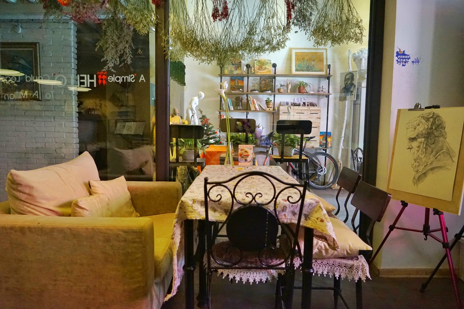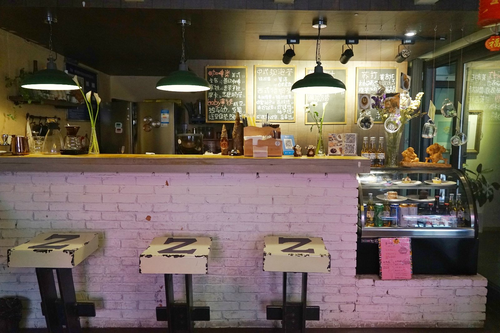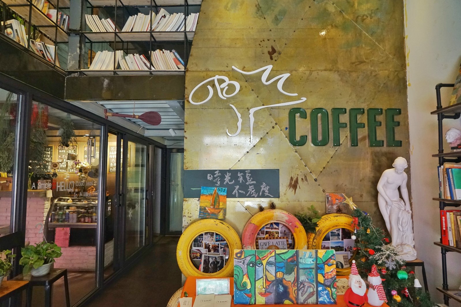 感觉店家应该是学设计出身的,大门口的绘画大大的提升氛围,三层还有个绘画室,还会在这边举办绘画课。一层是咖啡厅吗,吧台式的装修,五彩的高脚凳混合沙发座椅,玻璃门外的植物物语增添了几分活力。他们家的主题是自行车主题,第一次看到这个主题的,感觉还是蛮有意思的。