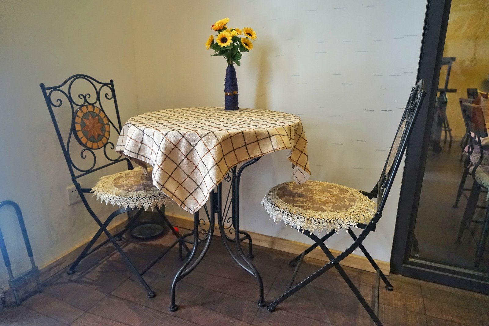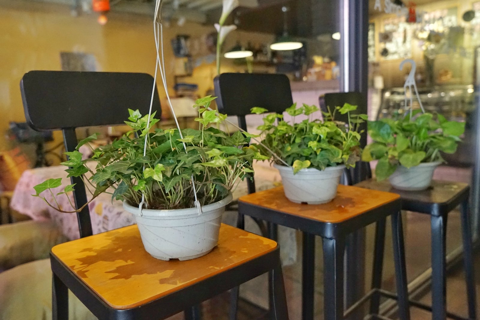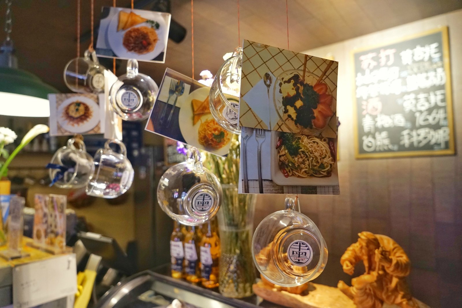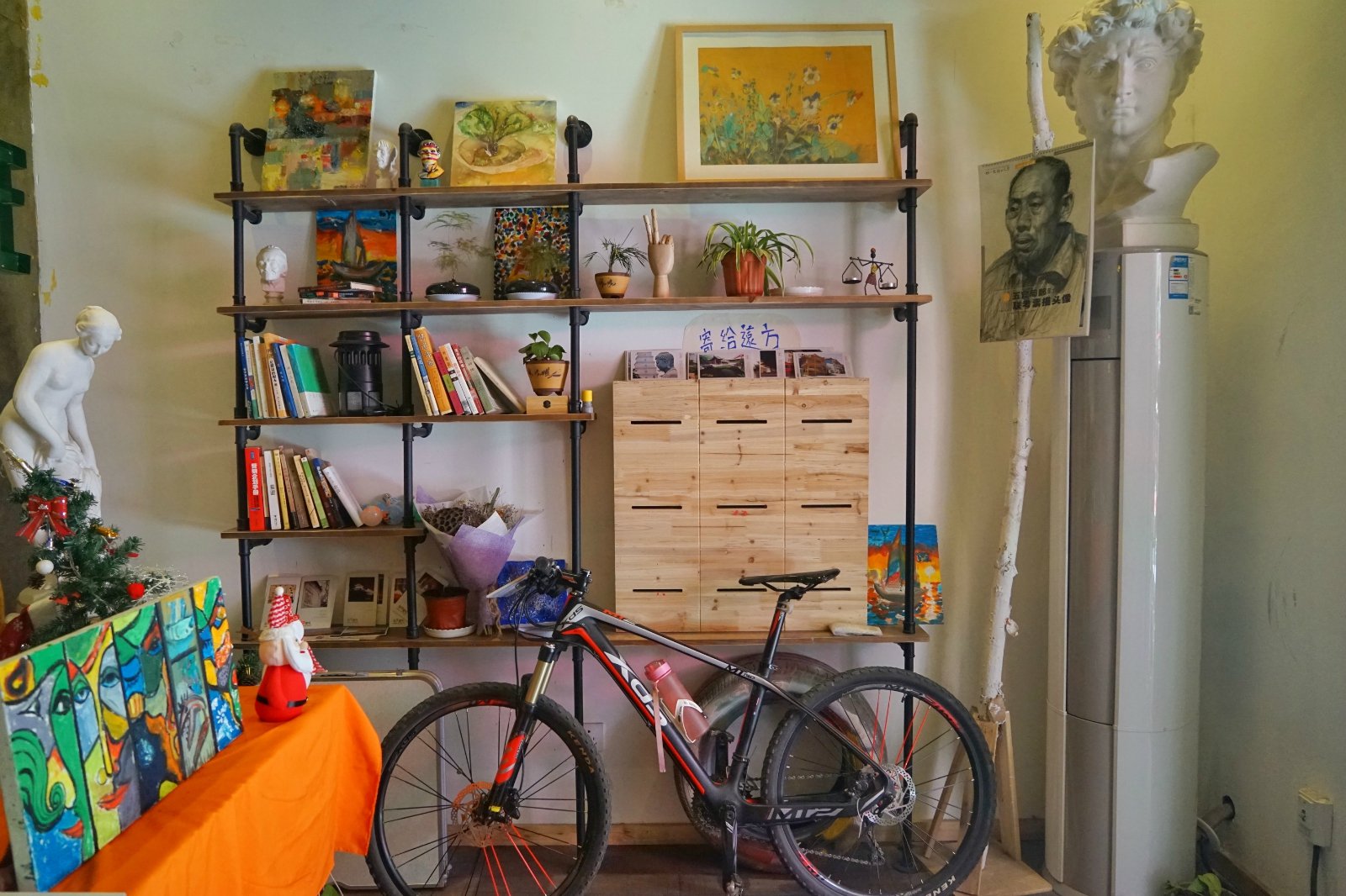 感觉店家应该是学设计出身的,大门口的绘画大大的提升氛围,三层还有个绘画室,还会在这边举办绘画课。一层是咖啡厅吗,吧台式的装修,五彩的高脚凳混合沙发座椅,玻璃门外的植物物语增添了几分活力。他们家的主题是自行车主题,第一次看到这个主题的,感觉还是蛮有意思的。