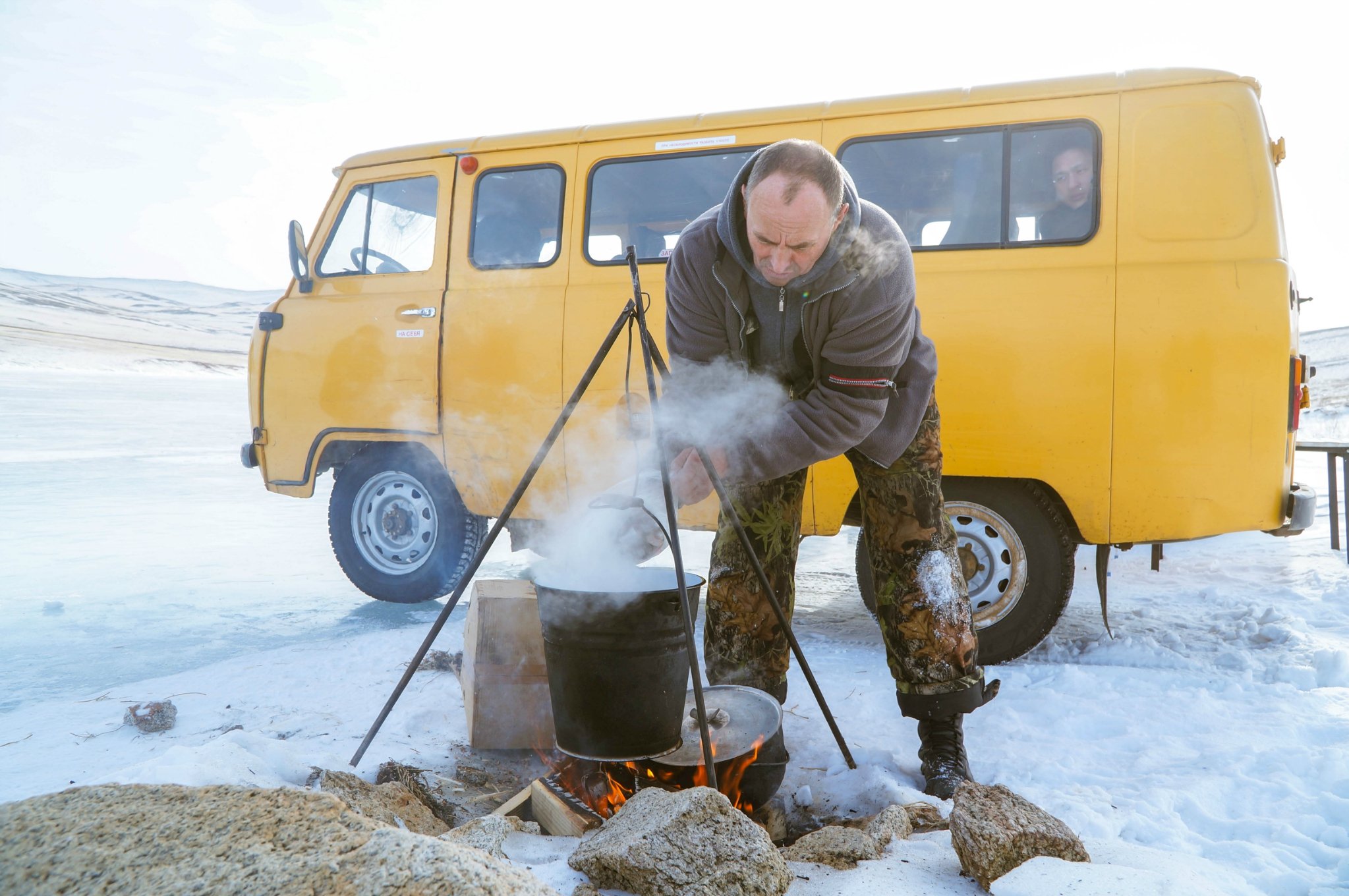 午饭时间,大叔直接在冰面上煮饭,今天喝的是鱼汤