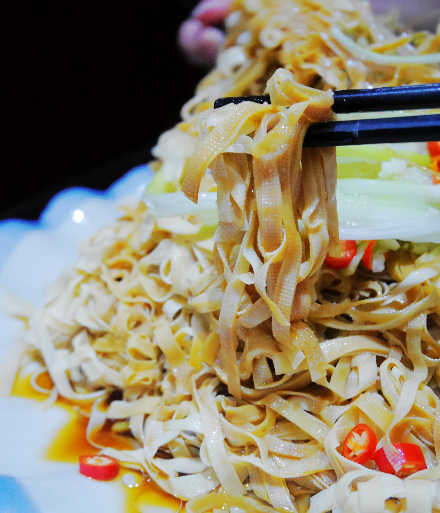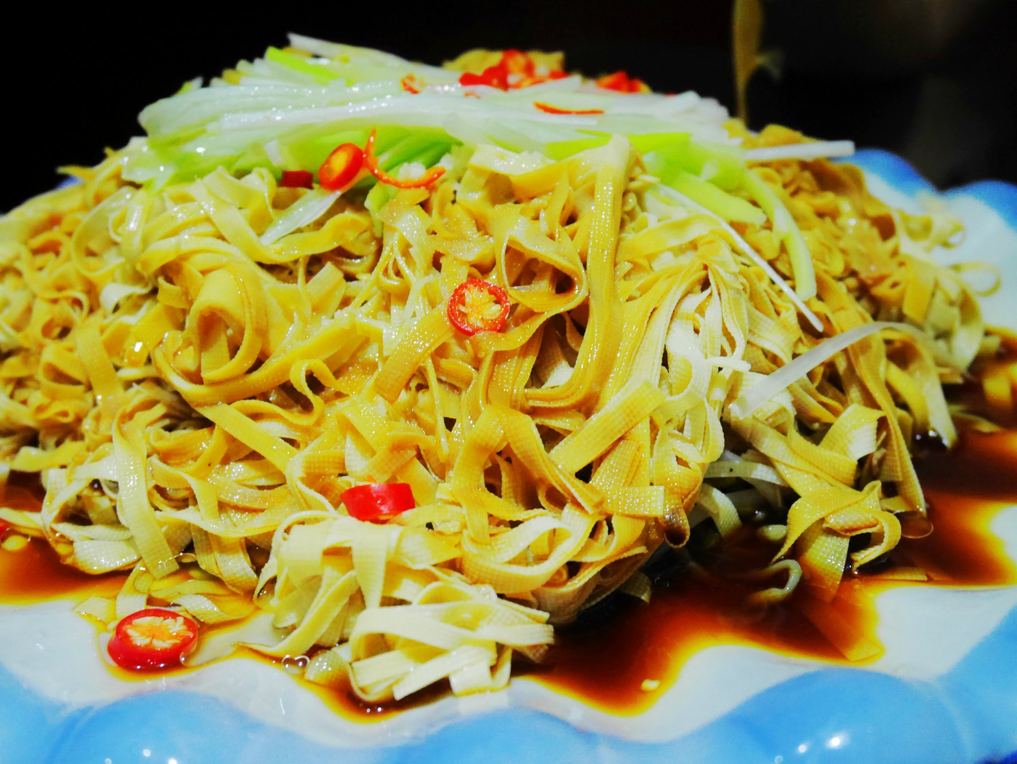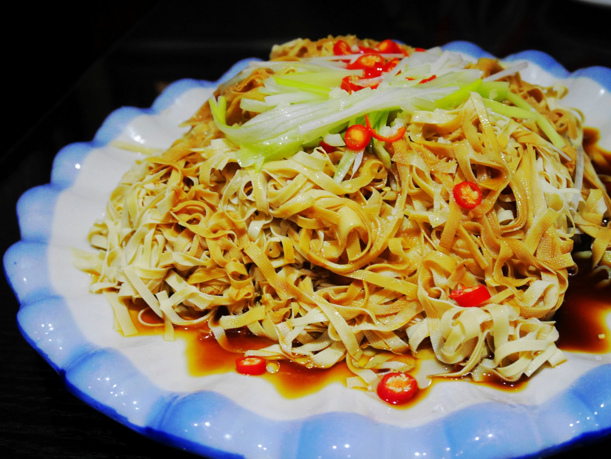 点了油泼干豆腐,因为当地人说本地的干豆腐好吃,是冷水豆腐,口感好,吃过之后有些失望,汤汁特别咸,也只是普通的酱油调味,葱油的部分有点少,而且干豆腐不是用老汤煮的,除了咸之外没有其他味道,口感也有些硬,除了豆腐比较薄之外一切都很普通。